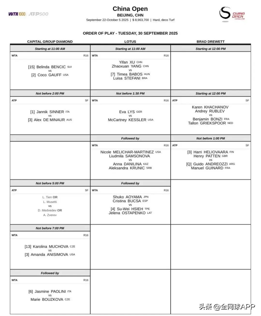 According to the schedule, tomorrow will feature the men’s singles semifinals and the women’s singles fourth round matches. Defending champion Gauff will open play on Diamond Court against 15th seed Bencic, followed by two men’s singles semifinals. The matches Anisimova vs Muchova and Paolini vs Buzkova will be contested in the evening session on Diamond Court.