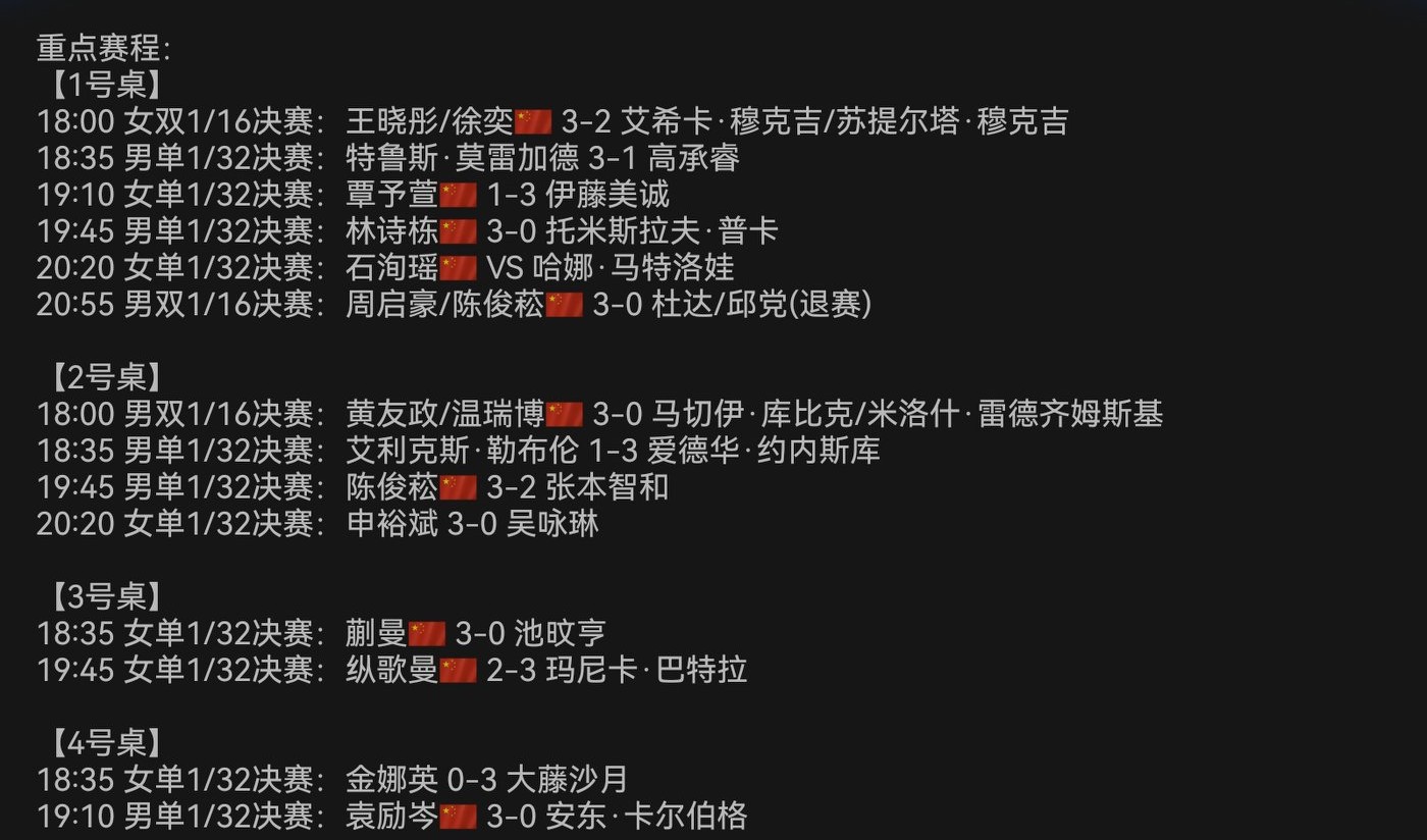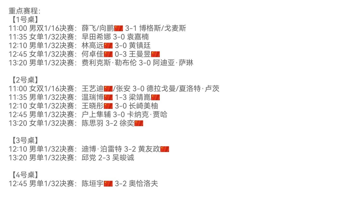 In the night session, 11 Chinese players (teams) competed, achieving a 7-4 record. Details are shown in the chart below, with highlights of several matches.