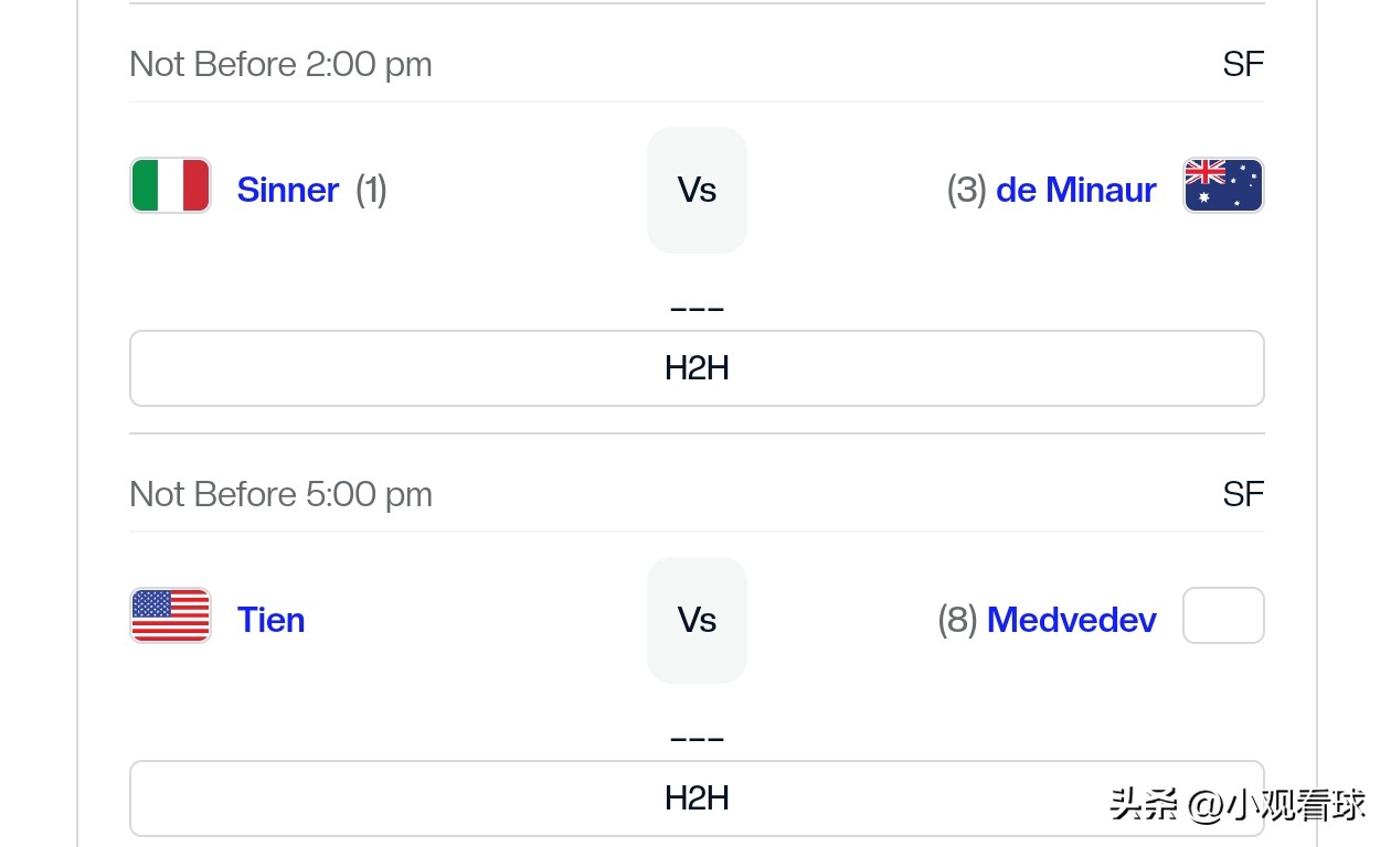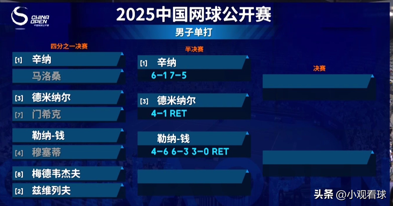 In the top half, Sinner defeated Marlosan 6-1, 7-5, while Deminor’s opponent Mensik retired before completing a set. The semifinal will be Sinner versus Deminor. Their head-to-head stands at 10-0, with Deminor having taken only one set off Sinner. Deminor’s technical strengths—quick movement and fast strokes—have been completely overwhelmed by Sinner.
