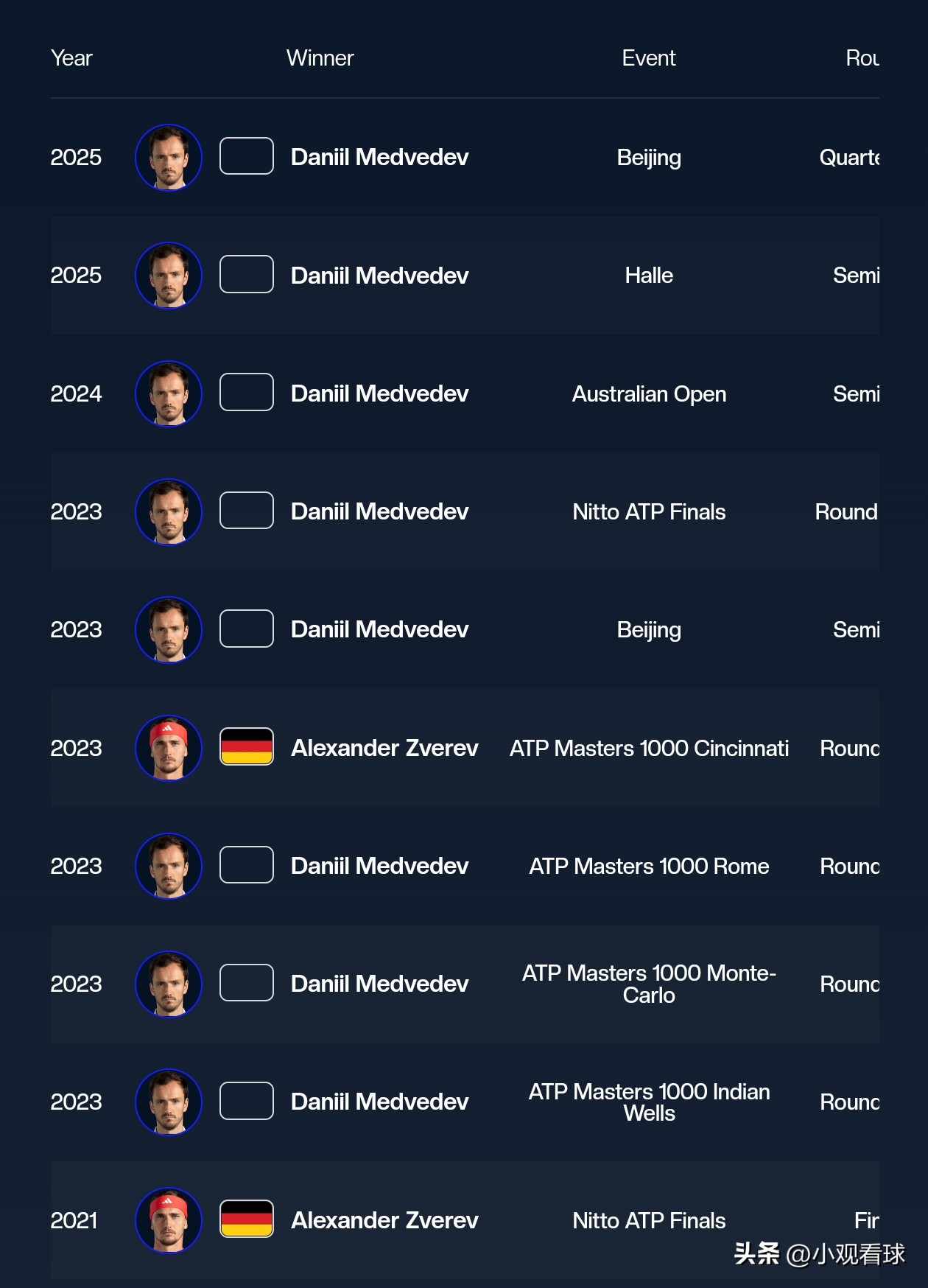 After Zverev’s exit, Medvedev will face Lener in the bottom half semifinal. Lener advanced by defeating fourth seed Musetti 4-6, 6-3, 3-0 after Musetti retired due to injury. Remember the Australian Open this year when Medvedev was eliminated early in the second round? His opponent then was Lener. They battled through five sets, including three tiebreaks, with Lener narrowly prevailing. The five-set score was 6-3, 7-6(4), 6-7(8), 1-6, 7-6(7).
