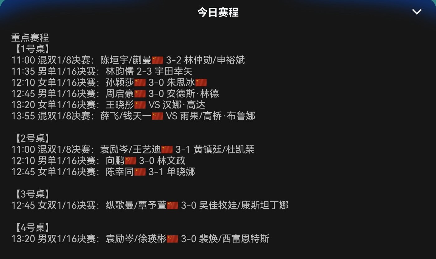 The matches involving Chinese players have concluded, and the detailed results are shown in the chart below.