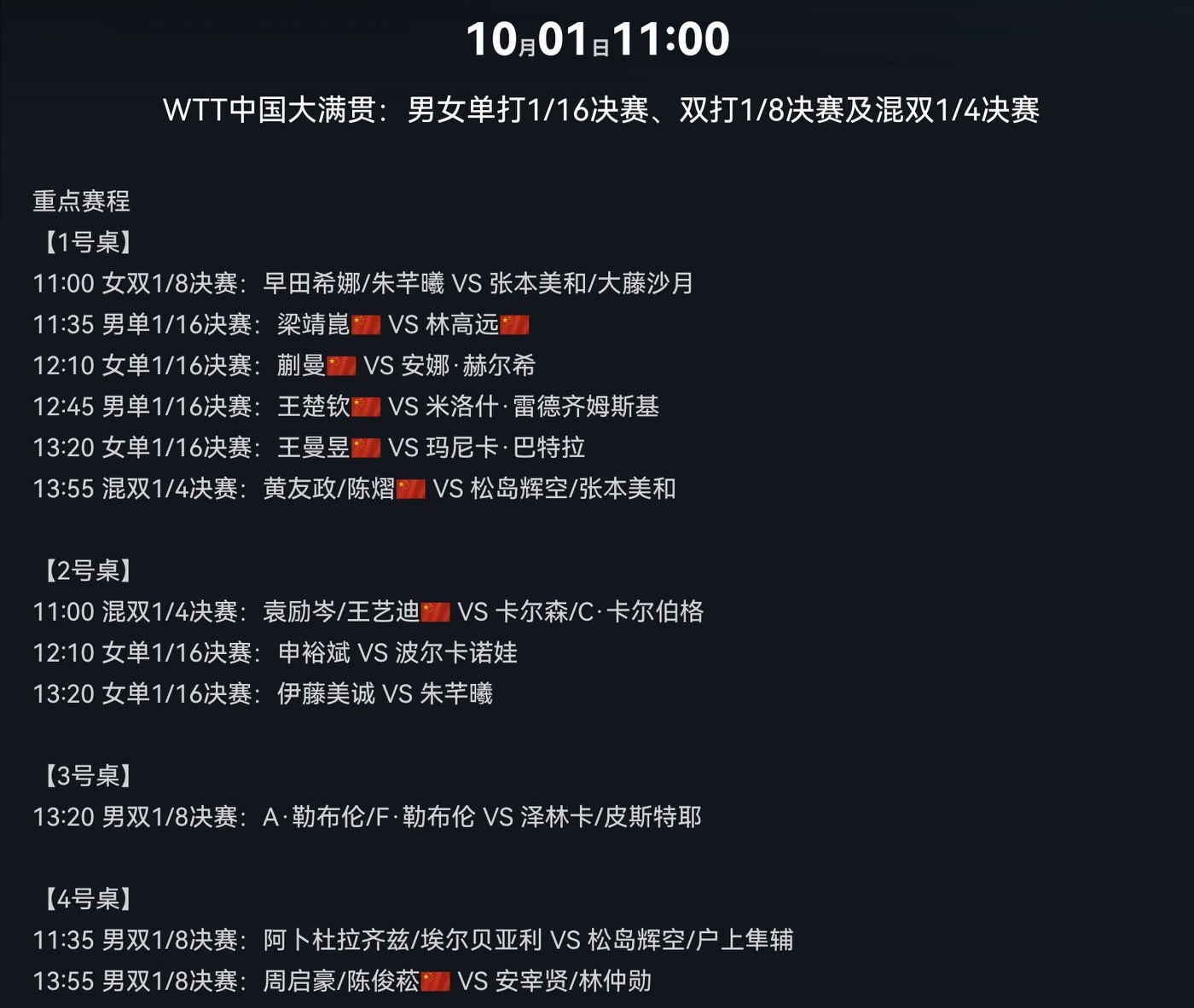 Today (October 1, 2025), the WTT China Grand Slam will host the singles round of 16, doubles round of 16, and mixed doubles quarterfinals, featuring Wang Chuqin and Sun Yingsha, with live coverage on CCTV-5, Yangshipin, and Migu Video.