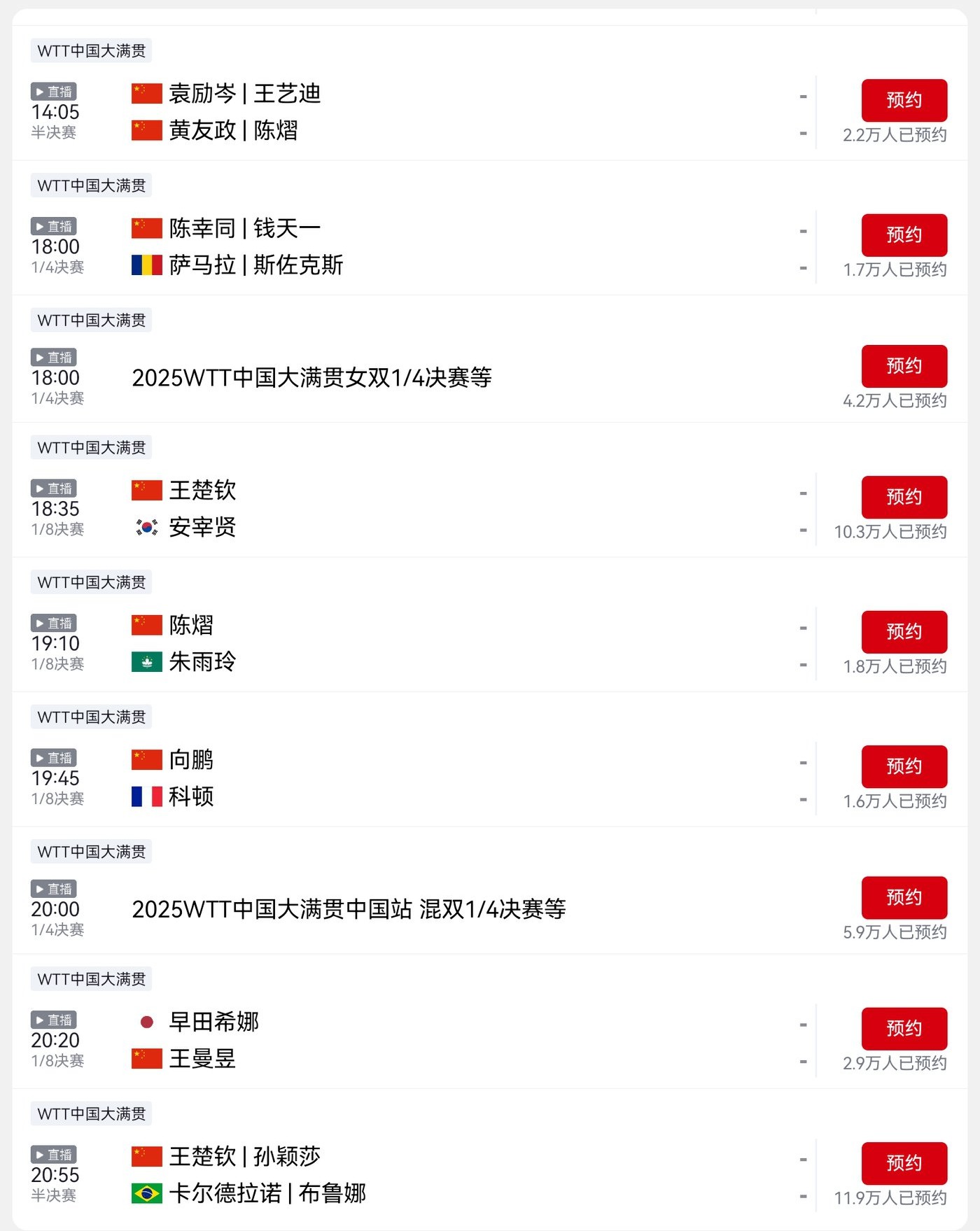 The image below shows the upcoming matches planned for broadcast on CCTV-5 today, awaiting players to take the stage. Enjoy watching!
