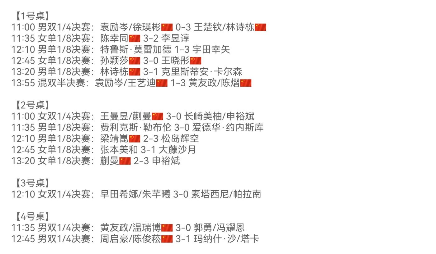 All the daytime matches have finished today, and in the singles competition, Kuai Man and Liang Jingkun lost their games and did not make it to the quarterfinals, which is regrettable.