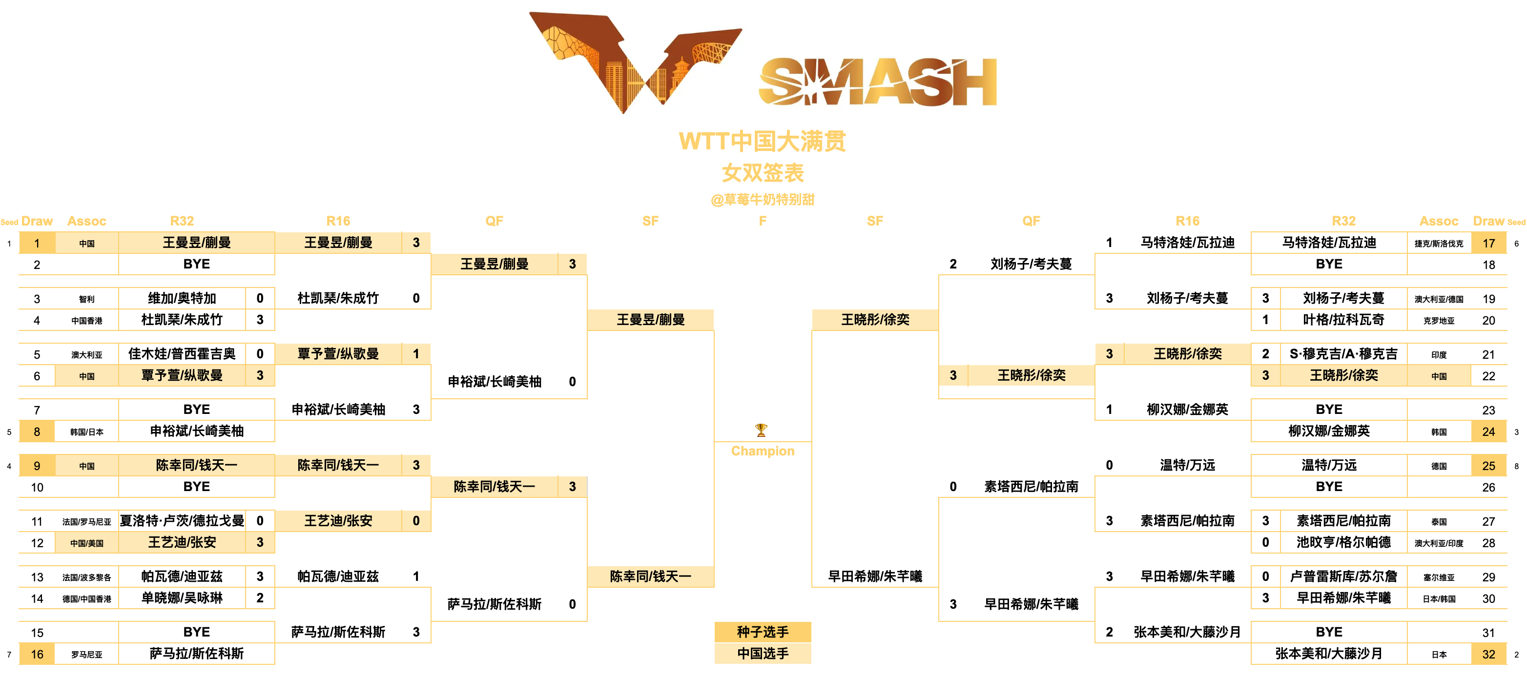 My personal prediction is that Wang Manyu/Kuai Man and Wang Xiaotong/Xu Yi will meet in the final, ensuring that Chinese players claim both the championship and runner-up positions.