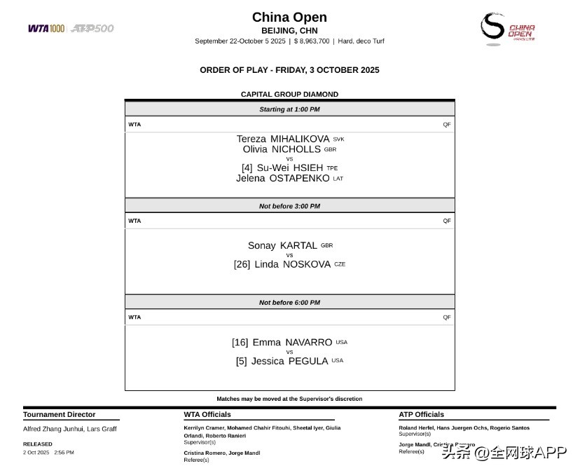 China Open schedule for October 3rd