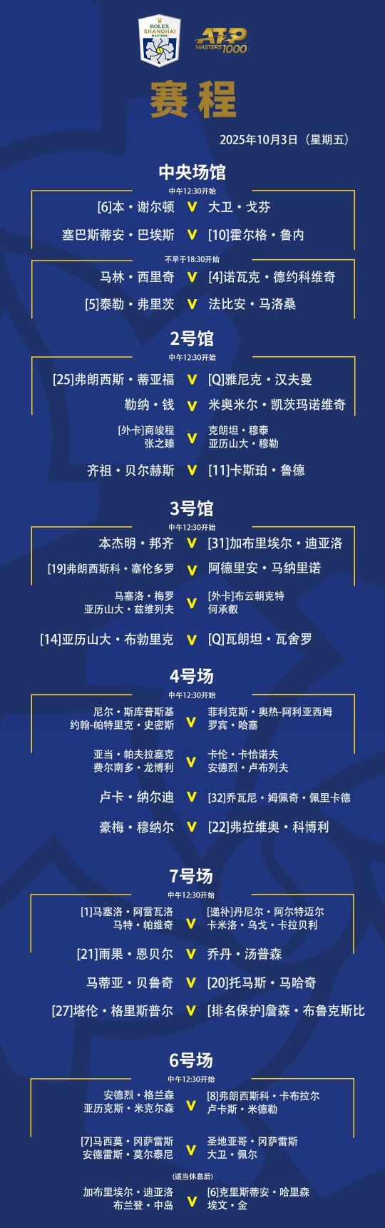 The Shanghai Masters tennis matches today (2025.10.3) will see Djokovic, Fritz, and Rune in action, with live streaming on CCTV.