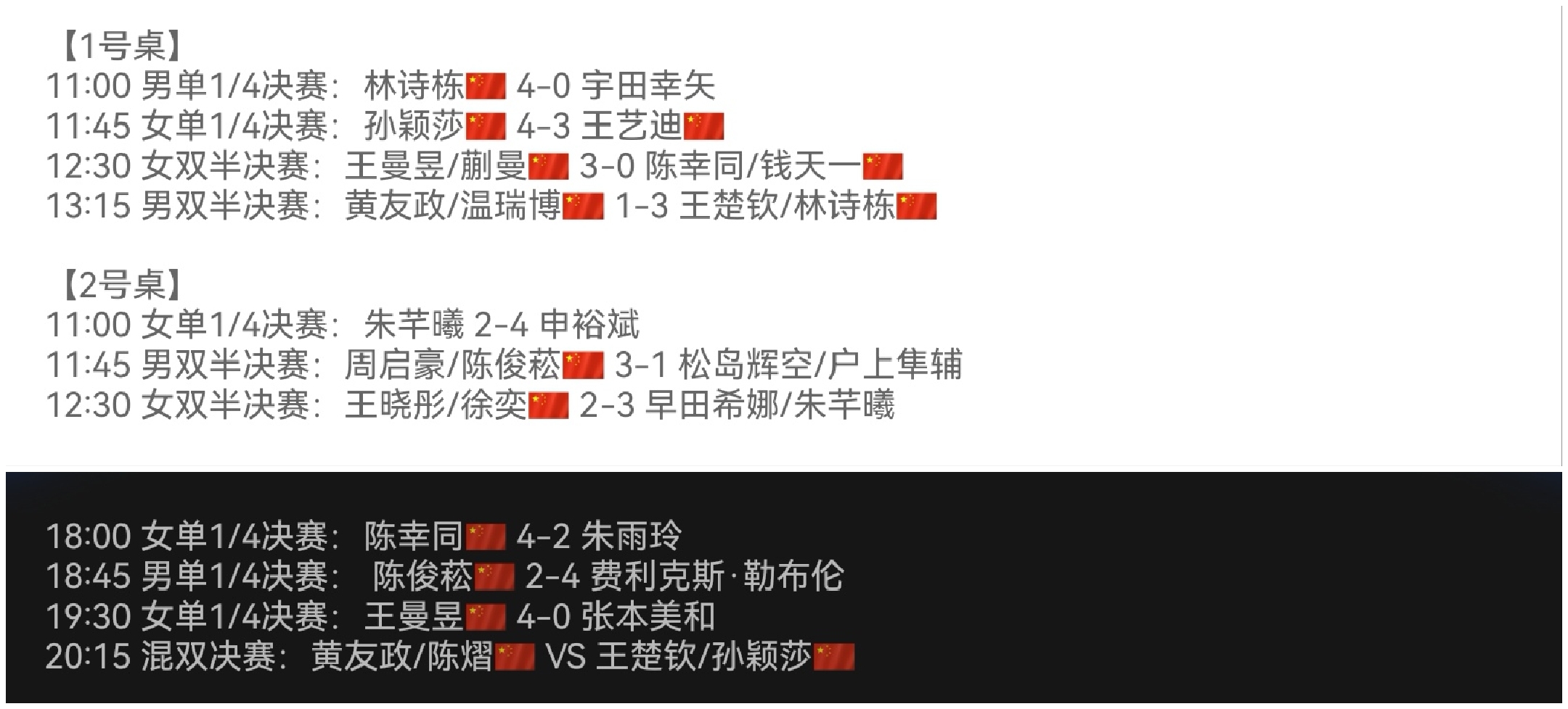 The mixed doubles final is already secured by Chinese players, well done. Lin Shidong has also advanced early to the men's singles semifinals, now awaiting Xiang Peng and Wang Chuqin!