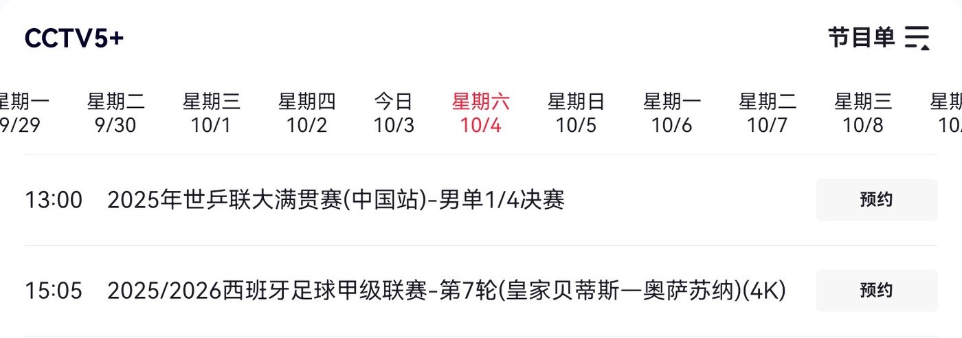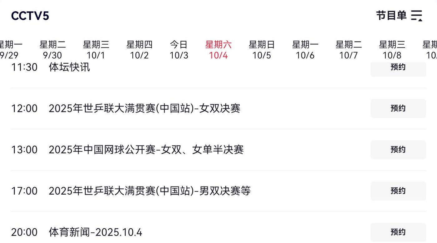 CCTV-5's live broadcast schedule, details are shown in the image below.