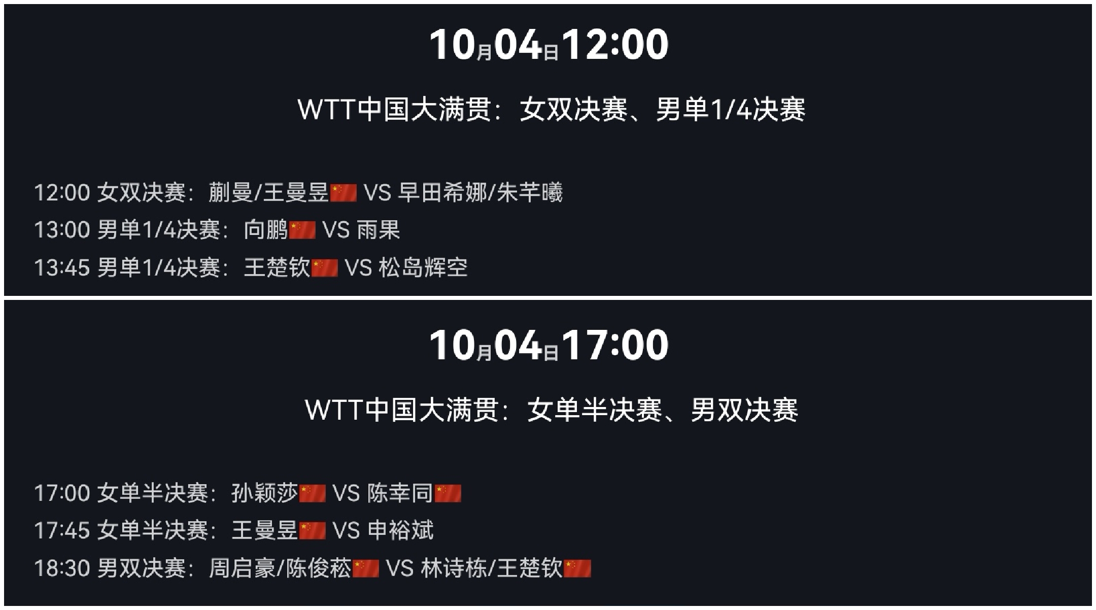 Tomorrow (October 4, 2025) at the WTT China Grand Slam, the women's and men's doubles finals will take place, along with men's singles quarterfinals and women's singles semifinals, featuring players such as Sun Yingsha, Wang Chuqin, Lin Shidong, and Xiang Peng, broadcast on CCTV-5.