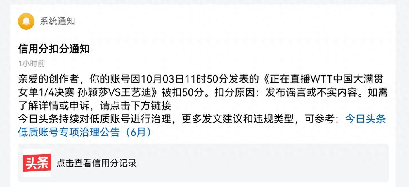This morning, as soon as I got up and opened Toutiao, I saw a system message telling me that 50 credibility points had been taken away, as shown in the image below.