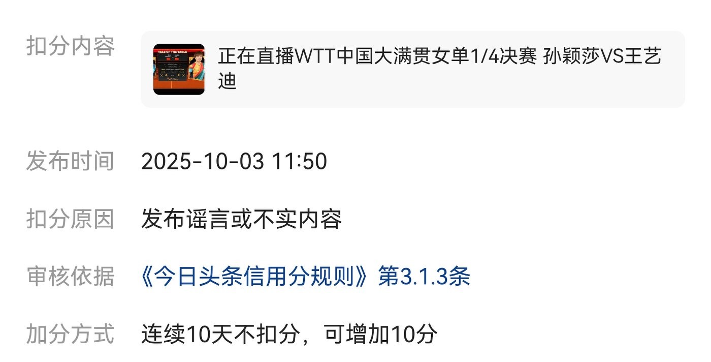 I know the cause well: during yesterday’s WTT China Grand Slam report, I accidentally entered "Wang Manyu" instead of "Wang Yidi." Due to the keyboard’s memory function, when typing the pinyin "wang," it automatically suggests previously entered names. I wonder if others have experienced the same. Some fans even pointed out my mistake yesterday, and I thanked them and corrected it immediately. Unfortunately, some fans or visitors reported me anyway, which led to the 50-point deduction.