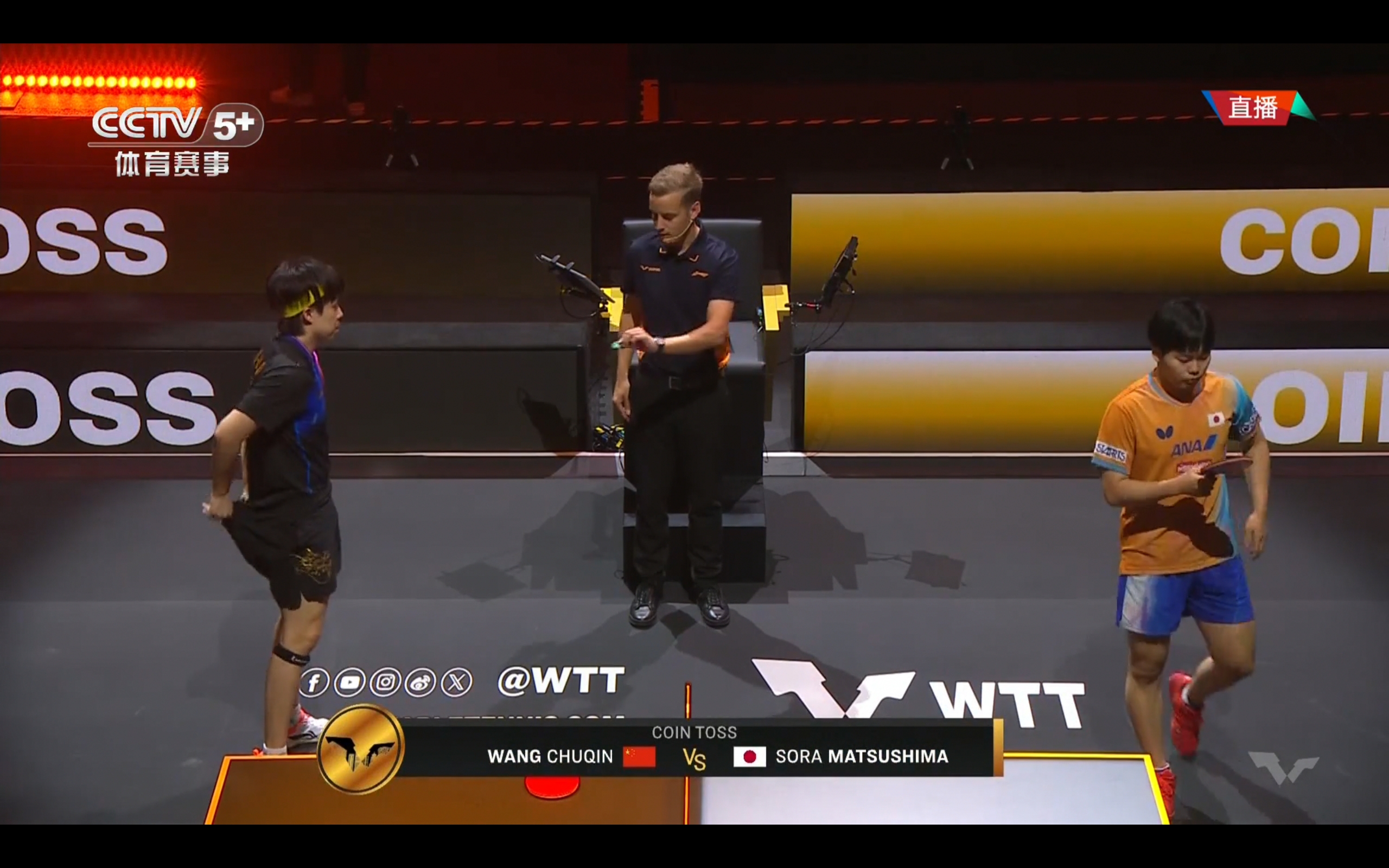 CCTV-5+ and Yangshipin are live streaming the WTT China Grand Slam men's singles quarterfinals featuring Wang Chuqin against Matsushima Hikaru.