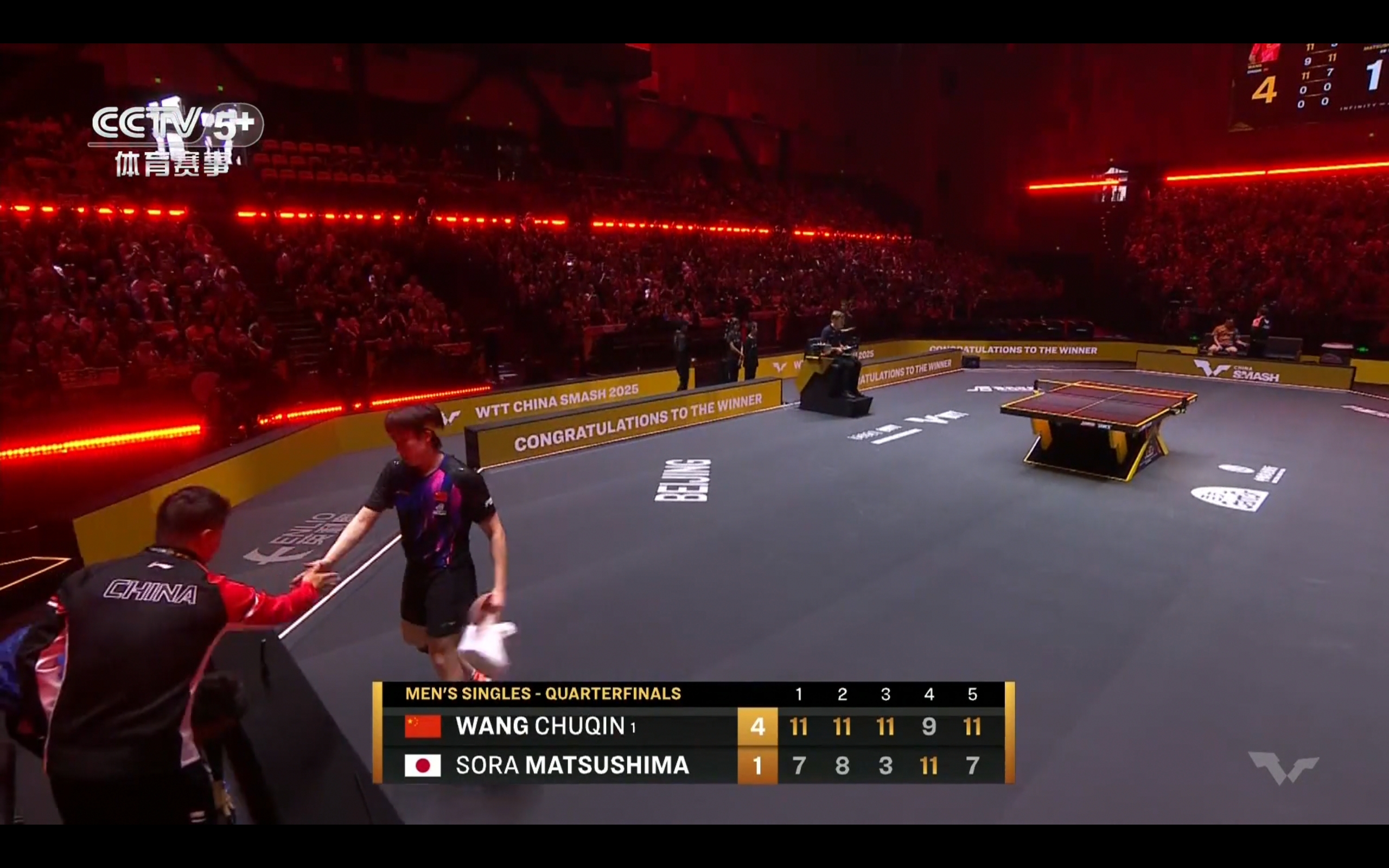 The third match, also a men’s singles quarterfinal, saw Wang Chuqin defeat Matsushima Hikaru 4-1. Wang Chuqin, China’s top male singles player, had just won the men’s doubles title. Today at the venue, he played brilliantly, firmly controlling his opponent Matsushima Hikaru. Although Matsushima took a game back in the fourth set, Wang Chuqin quickly adjusted his strategy and secured the win to advance to the semifinals.