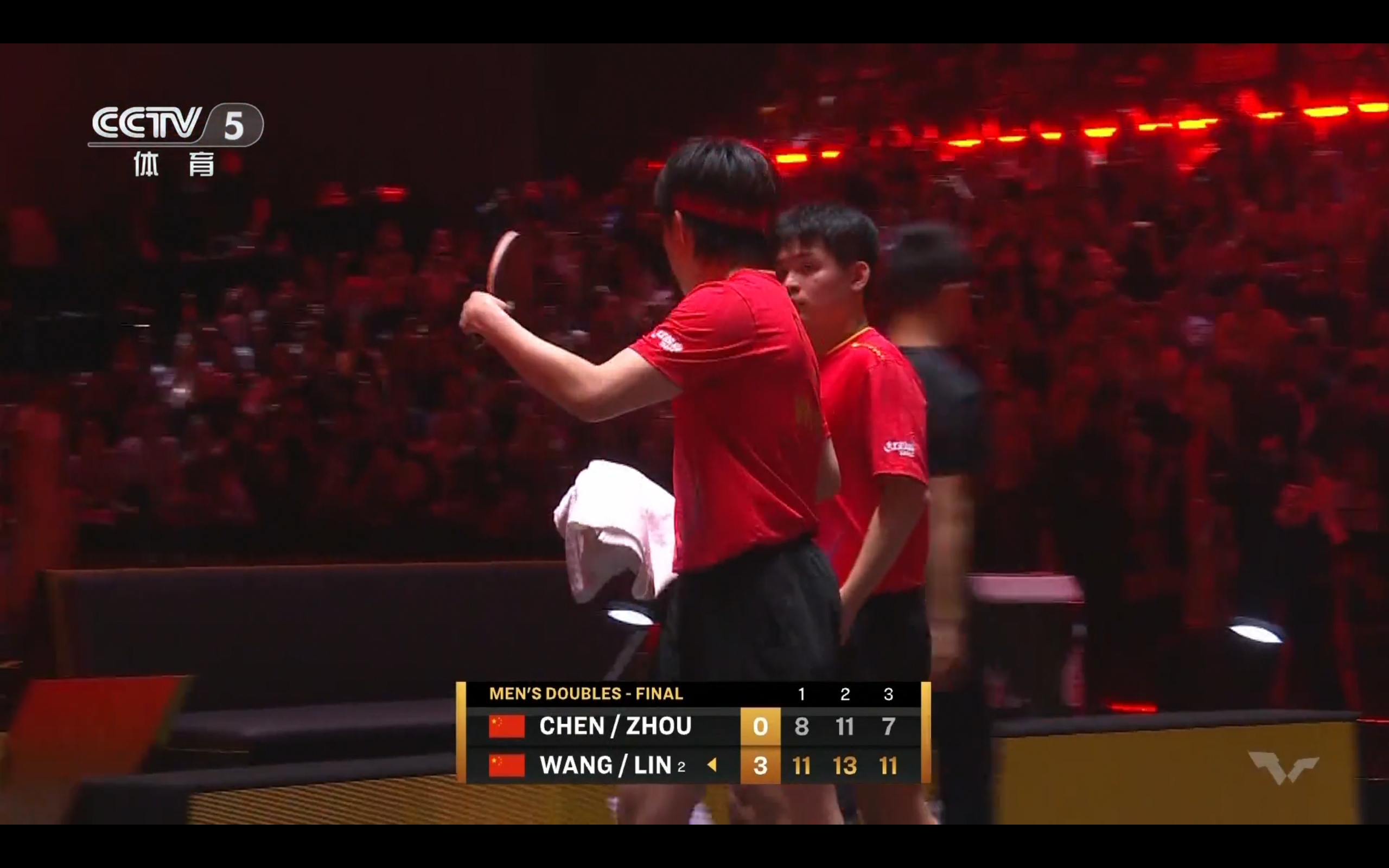 The set scores were 11-8, 13-11, and 11-7, with Wang Chuqin and Lin Shidong winning the match 3-0 overall to claim the championship.