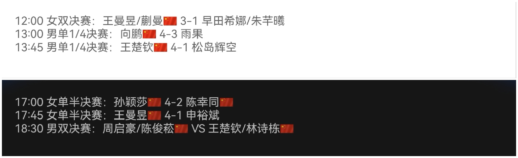 Especially notable was Xiang Peng, who triumphed 4-3 over Hugo to reach the semifinals. This achievement deserves high praise, effectively blocking the strongest foreign male player from the semifinals and ensuring a Team China sweep of the men's singles top two spots!