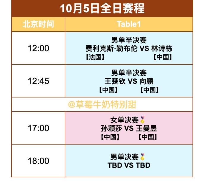 At 12:45 noon tomorrow, the men's singles semifinal will be Wang Chuqin against Xiang Peng.