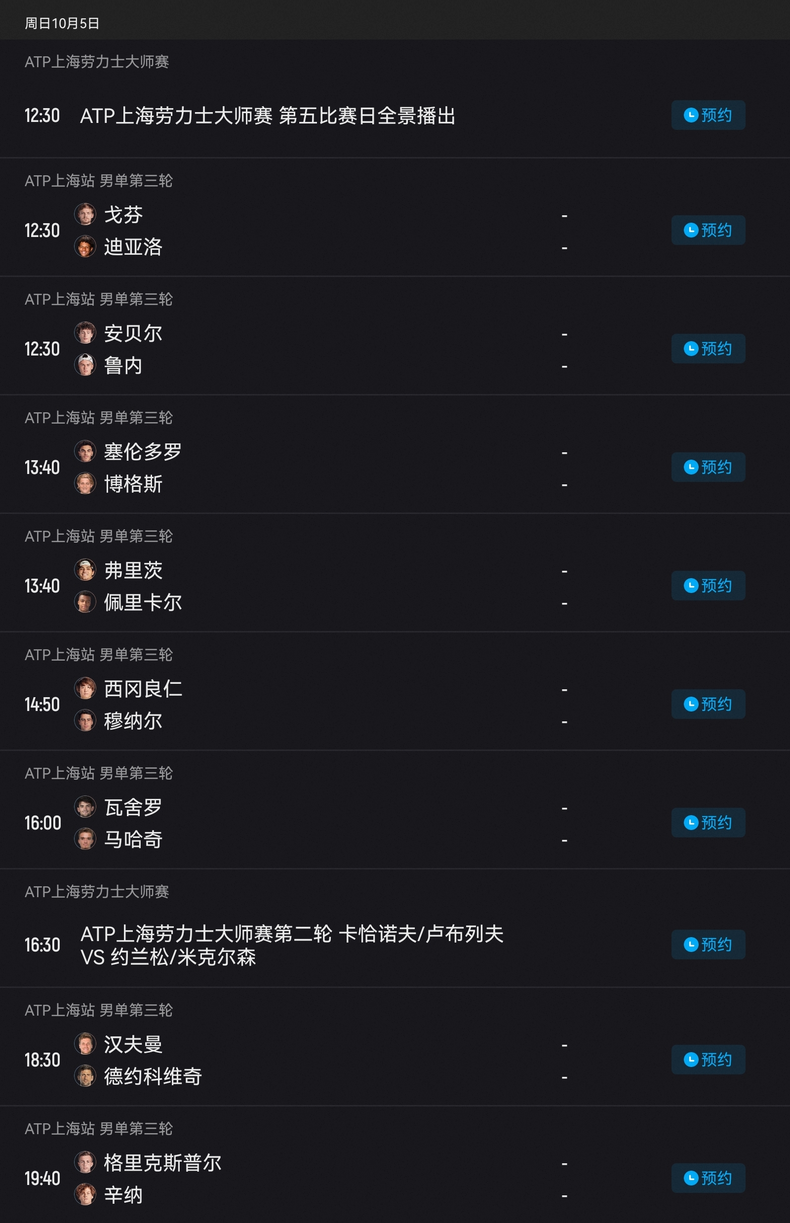 The tennis schedule for the Shanghai Masters today (2025.10.5) features Sinner and Djokovic among the competitors, with live streaming on Youku and CCTV Video.
