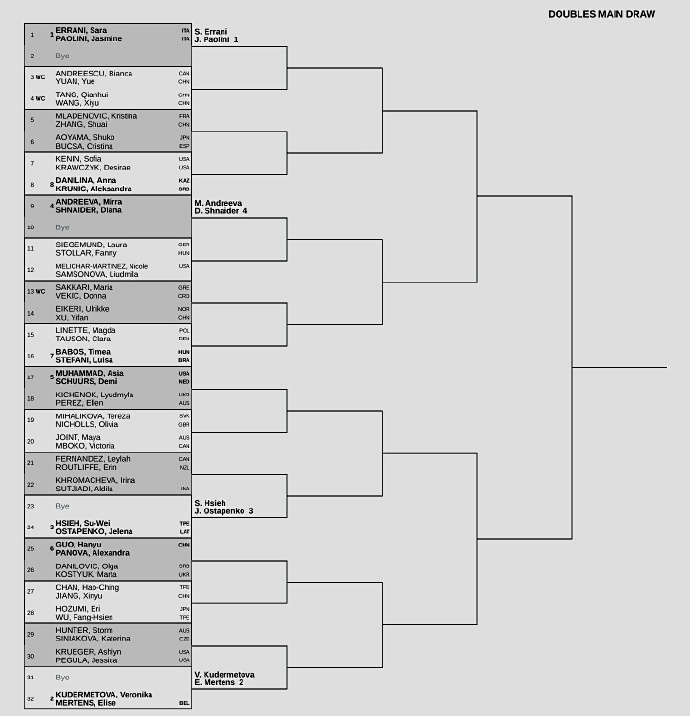 Doubles draw:Andrescu/Yuan Yue vs. Tang Qianhui/Wang Xiyu,Zhang Shuai/Muradnovic vs. Aoyama/Shuko Buksha,Xu Yifan/Aikeri vs. Sakkari/Vekic,Guo Hanyu/Panova vs. Danilovic/Kostyuk,Jiang Xinyu/Zhan Haoqing vs. Hozumi/Eri Wu Fangxian.