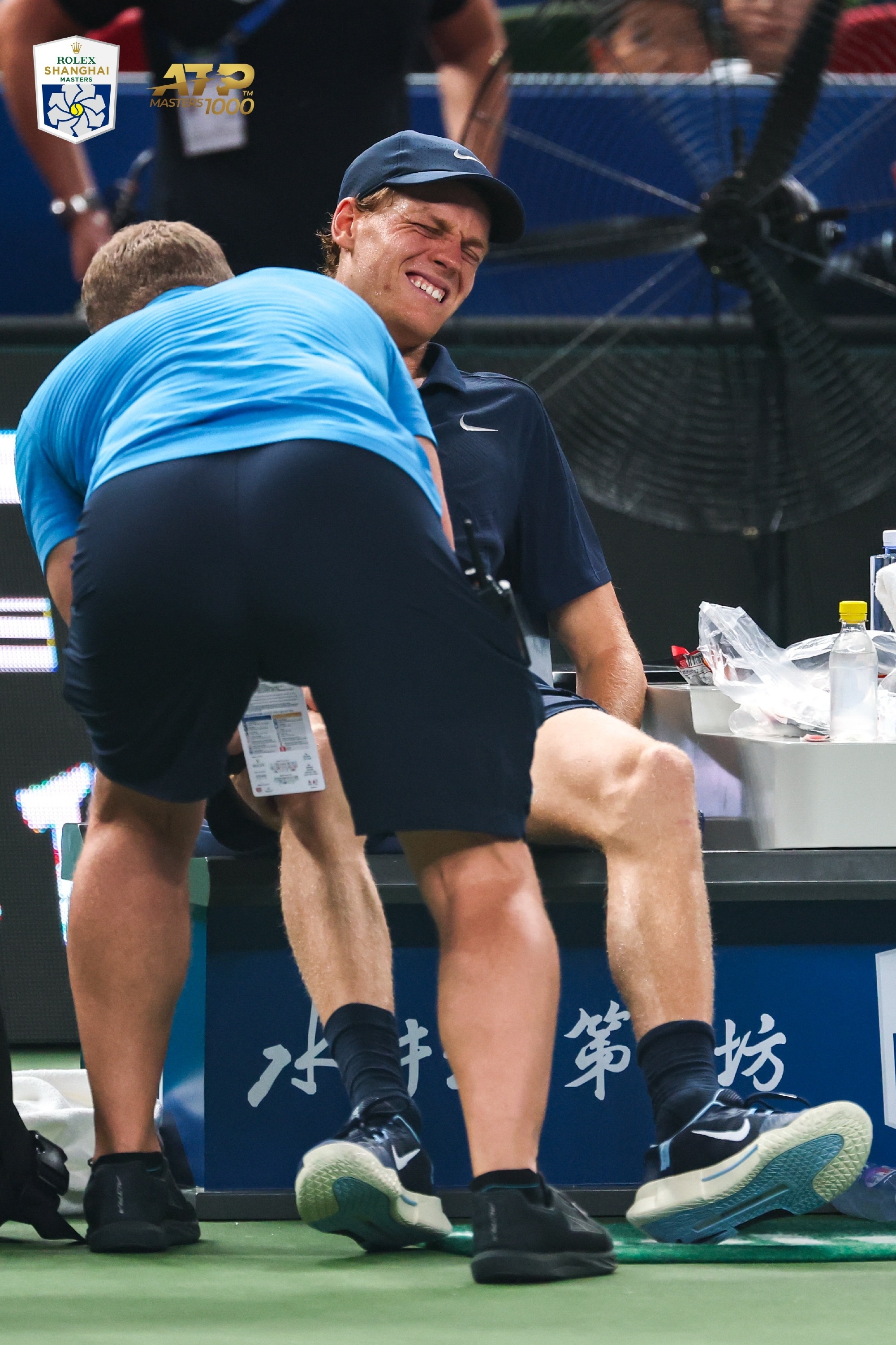 However, on the same court just hours later, a heartbreaking scene unfolded. Sinner, fresh off his Beijing Open title, battled until midnight but had to retire trailing 2-3 in the final set due to severe cramping. The stubborn figure struggled to move as medical staff rushed to assist — a harsh consequence of consecutive matches without adequate recovery.