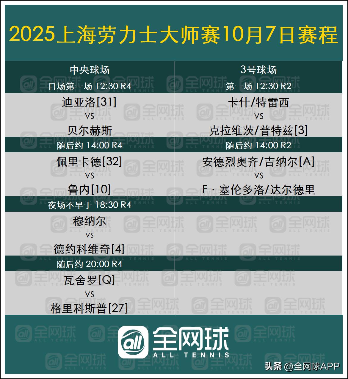 The Day 7 schedule for the 2025 Shanghai Rolex Masters includes the men’s singles fourth round and the remaining men’s doubles second round contests. The opening match on center court pits 31st seed Diallo against Belgium’s Belkhers; the 10th seed Rune will then play against French hitter Pericard.
