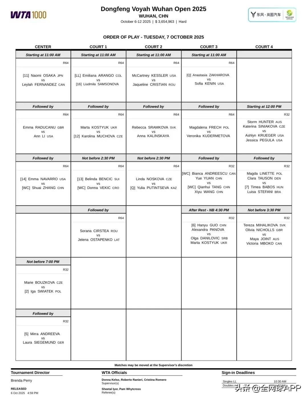On October 7th, the highlight match between Naomi Osaka and Fernandez will open the day session on the central court. The second match features Raducanu versus Ann Li, followed by Chinese player Zhang Shuai challenging 14th seed Navarro. The night session will be led by 2nd seed Swiatek and 5th seed Andreyeva, facing Buzkova and Sigmund respectively. Yuan Yue, Tang Qianhui, Wang Xiyu, and Guo Hanyu will compete in the first round of the women’s doubles.