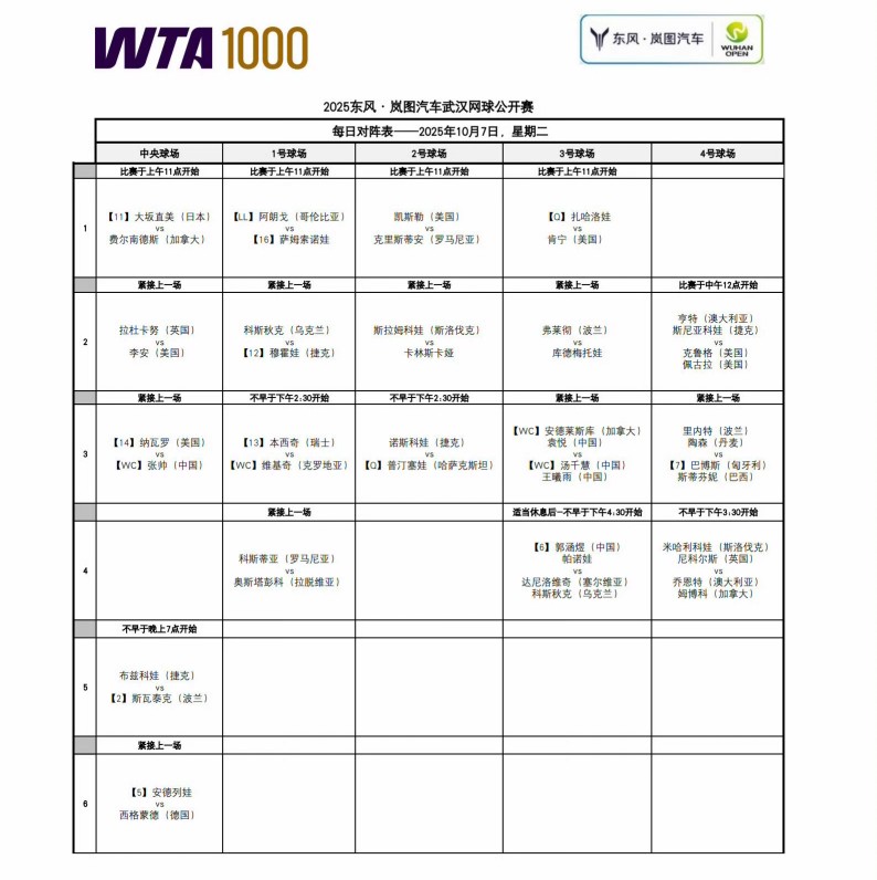 All the match arrangements for today at the Wuhan Open have been finalized, as shown in the image below. The highlighted matches are detailed here.
