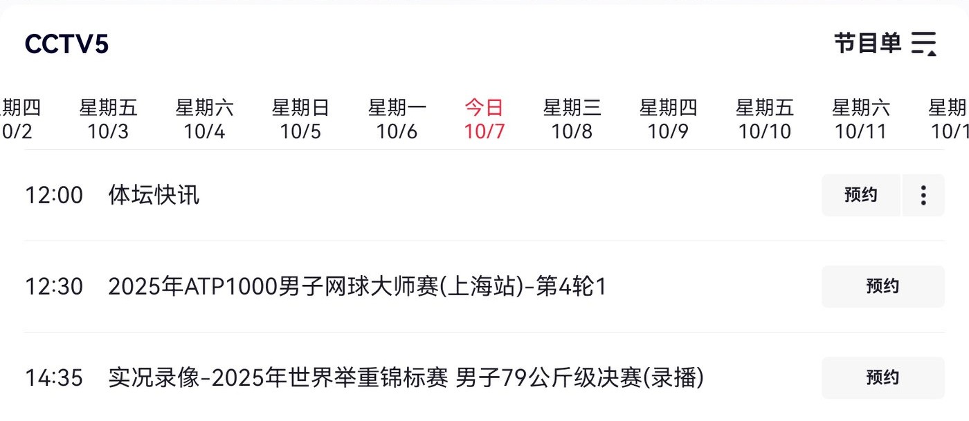 The CCTV-5 broadcast schedule is displayed in the image below.
