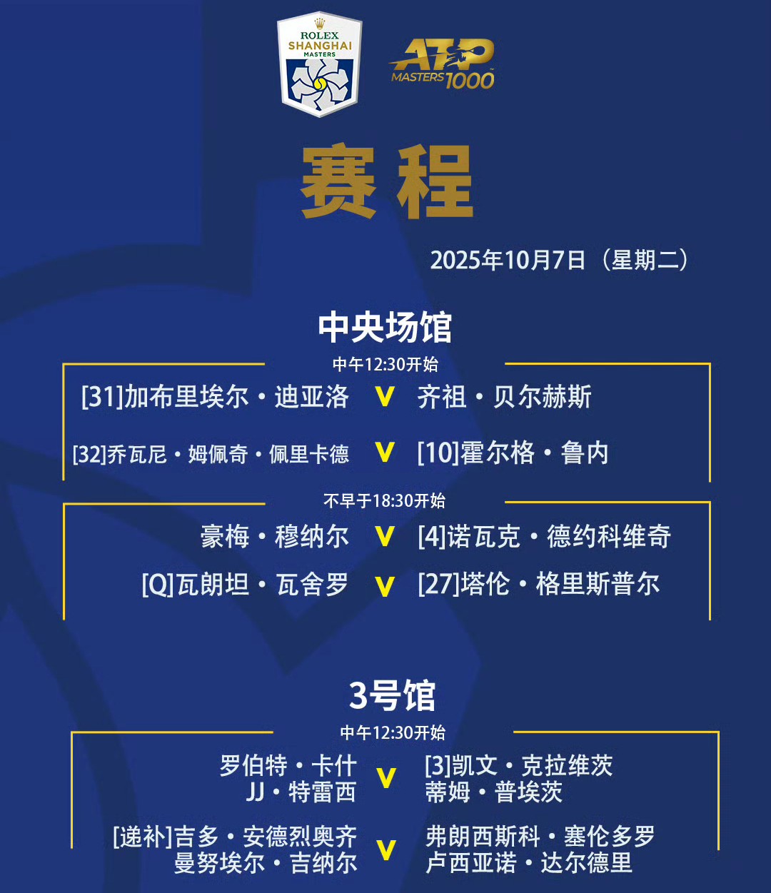 The Shanghai Masters schedule for today (10.7) features Djokovic, Rune, and others competing, broadcast on CCTV-5 and live on Youku.
