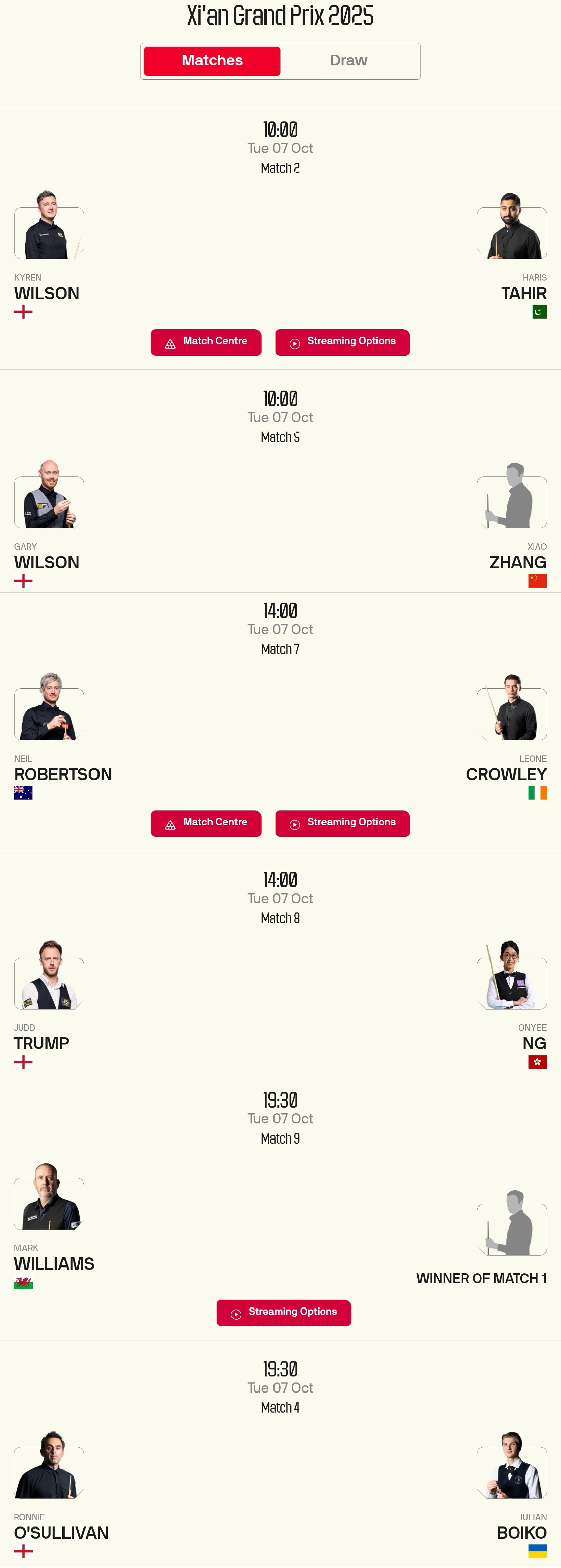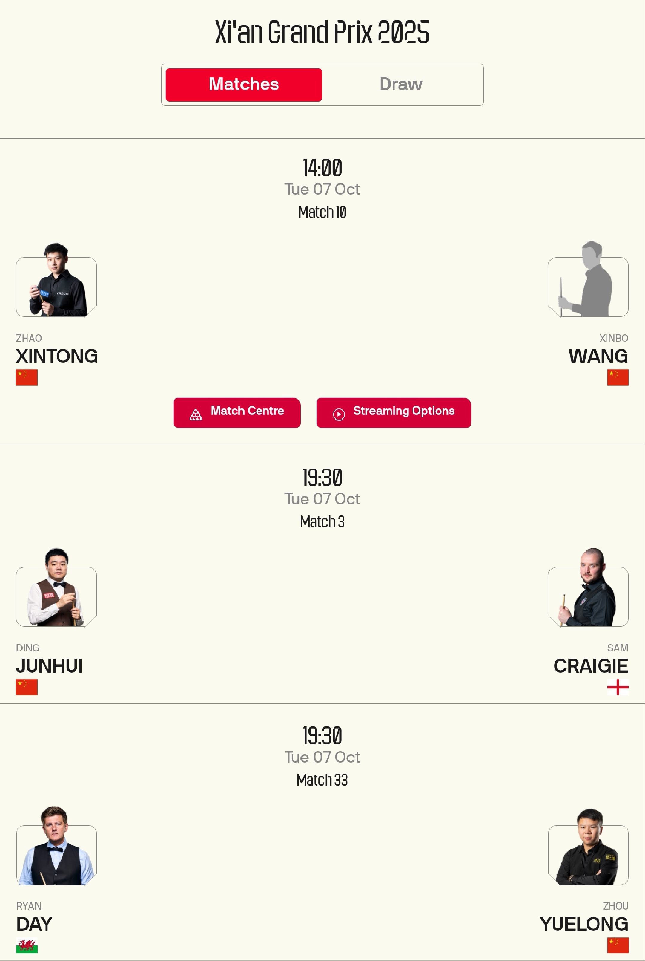 The Snooker Xi'an Masters schedule for today (2025.10.7) includes Zhao Xintong, Ding Junhui, Zhou Yuelong, O'Sullivan, Wilson, Trump, and Mark Williams, all competing live on Huya.