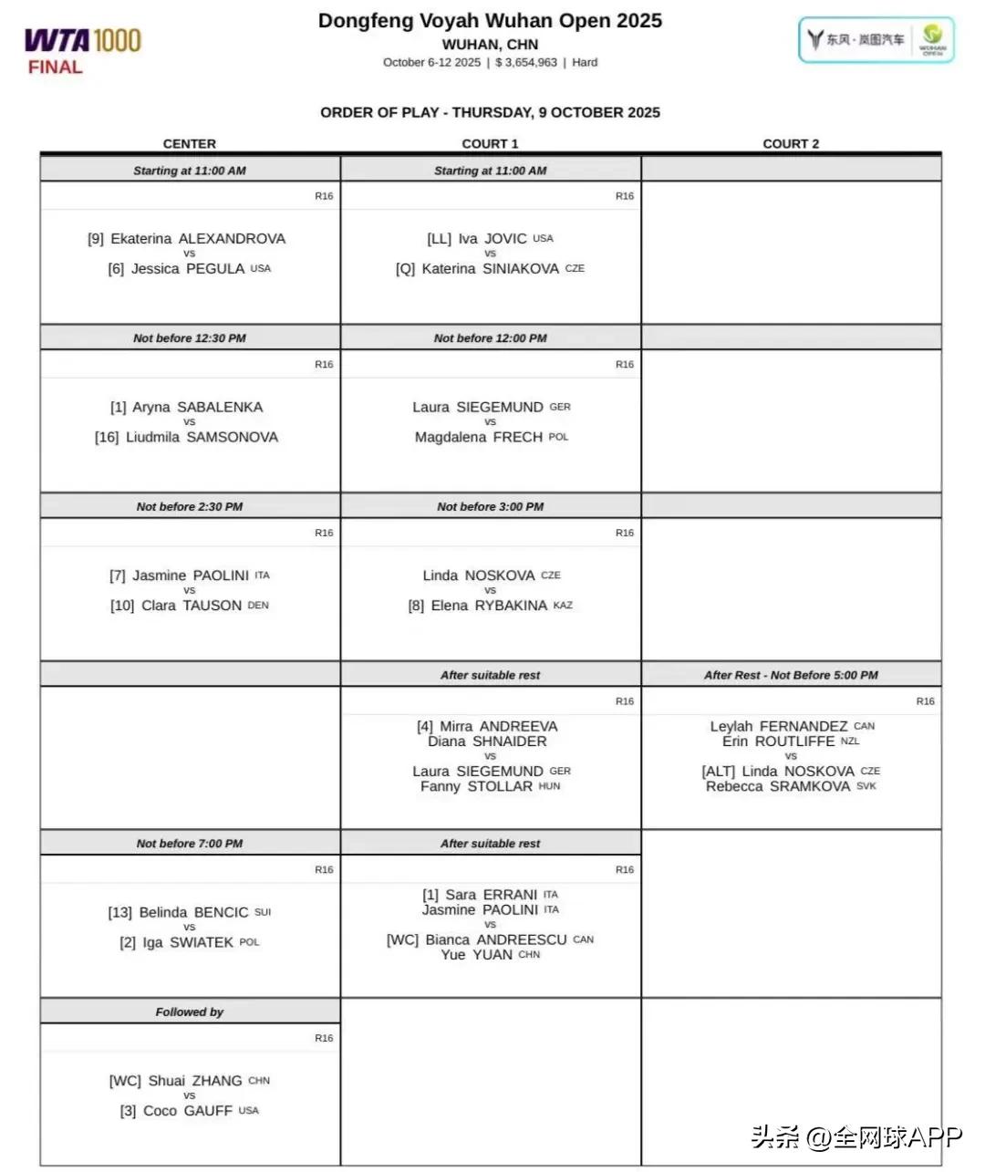 The schedule for October 9 has been released, with women’s singles third-round matches set to take place. Sabalenka, Rybakina, and Pegula will return to the center court aiming for quarterfinal spots. The highlight night match features 2nd seed Swiatek versus Swiss star Bencic, followed by Zhang Shuai facing 3rd seed Gauff as the final match. Other courts will host additional women’s singles third-round and doubles second-round contests.