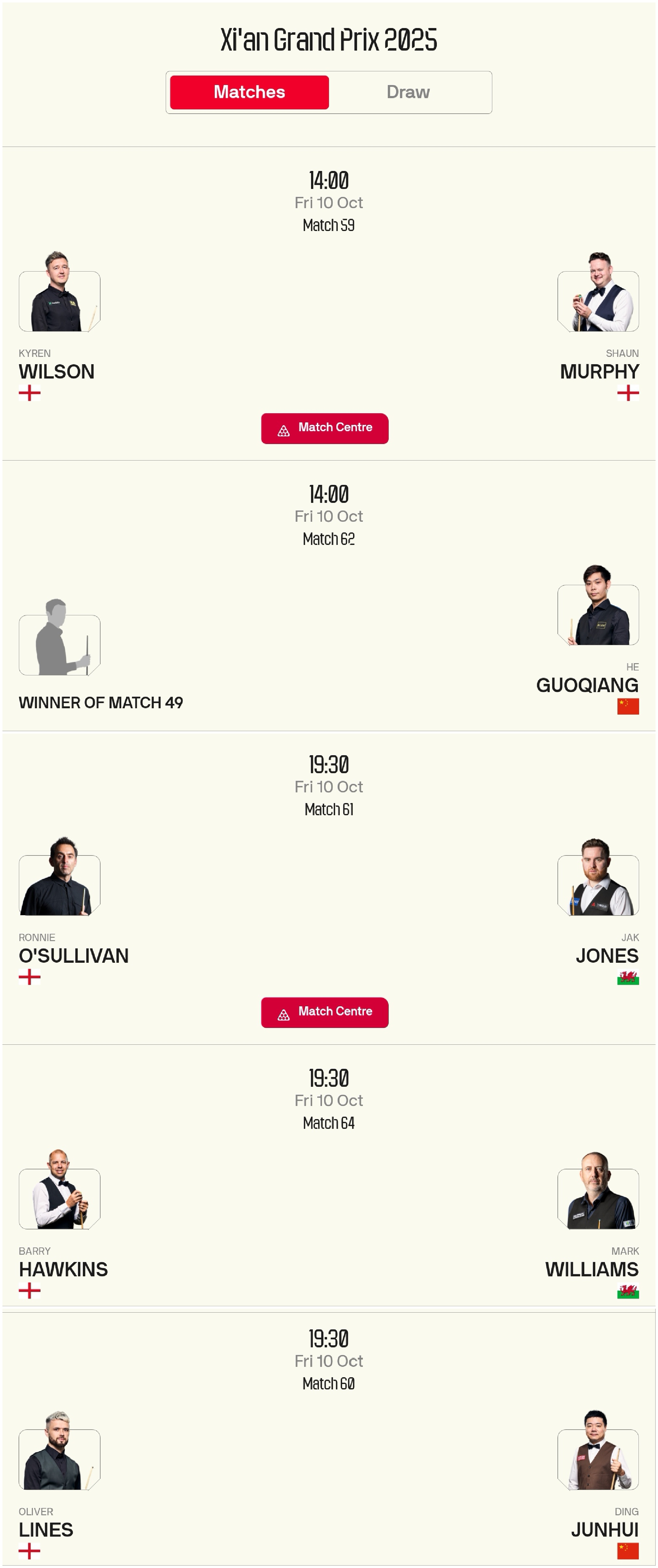 Additionally, at 2 PM tomorrow afternoon, Kyren Wilson will play against Shaun Murphy.