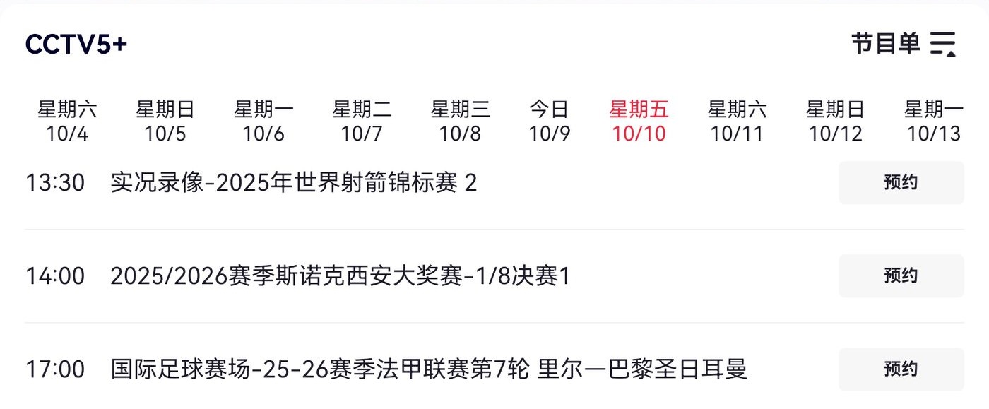 The live broadcast schedule on CCTV-5, the CCTV video app, and Huya streaming platforms is shown in the image below.