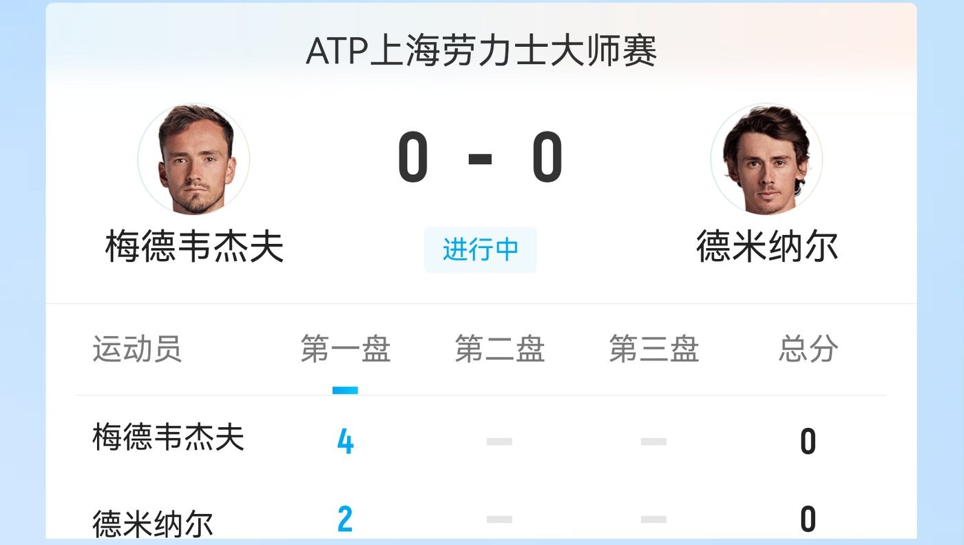 This match follows a best-of-three sets format, and currently, they are playing the first set with the score at Deminor 2-4 Medvedev.