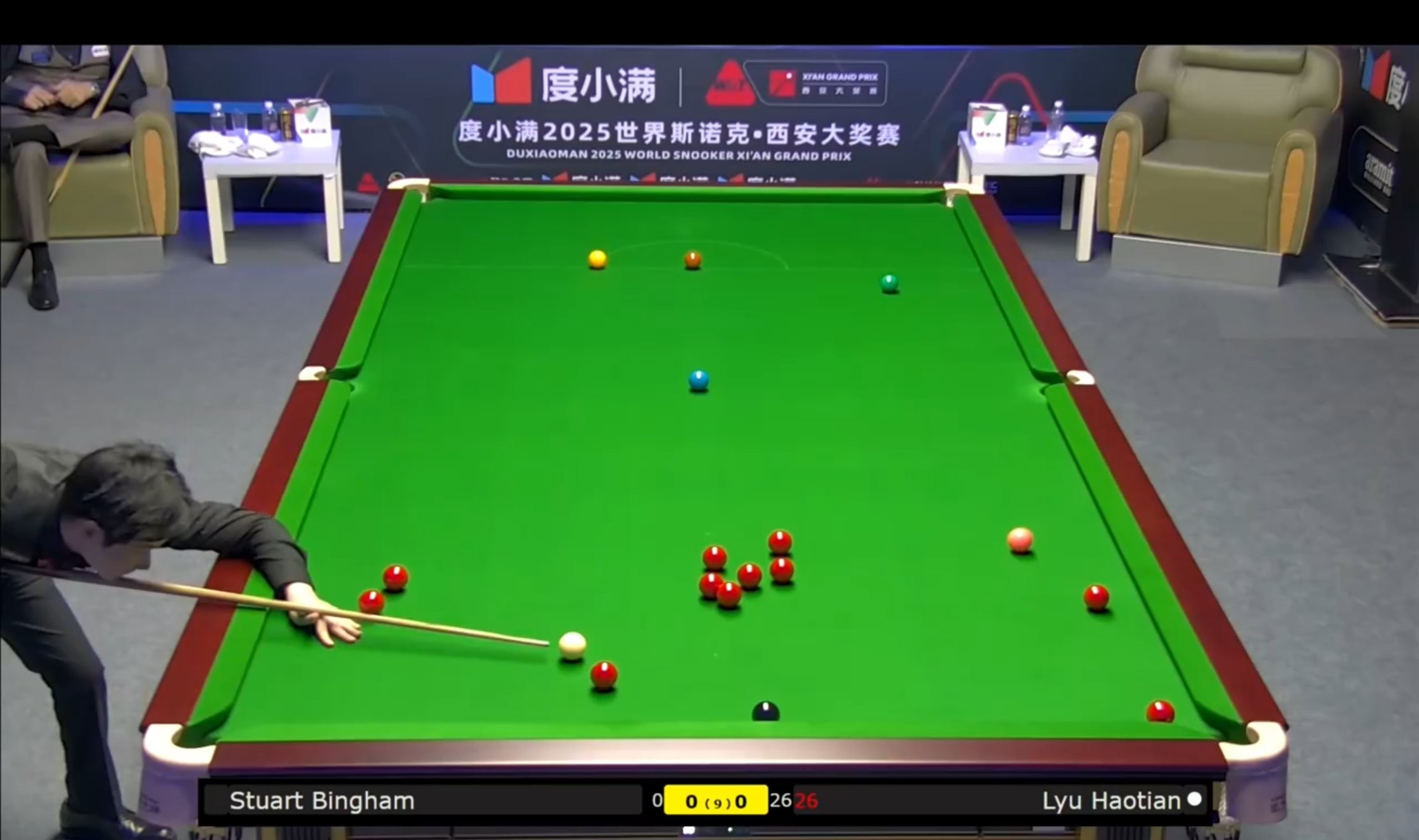Yangshipin is streaming Wu Haotian’s match live, also in a best-of-9 frames format, currently 0-0 against Bingham.