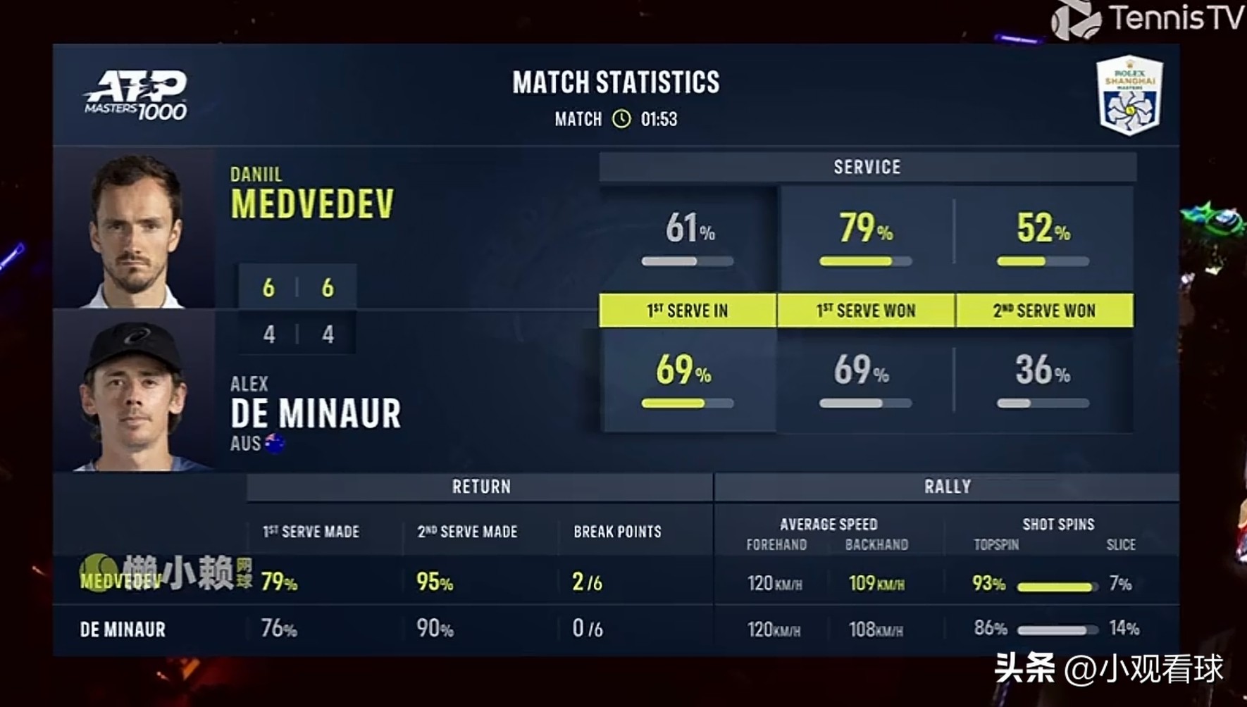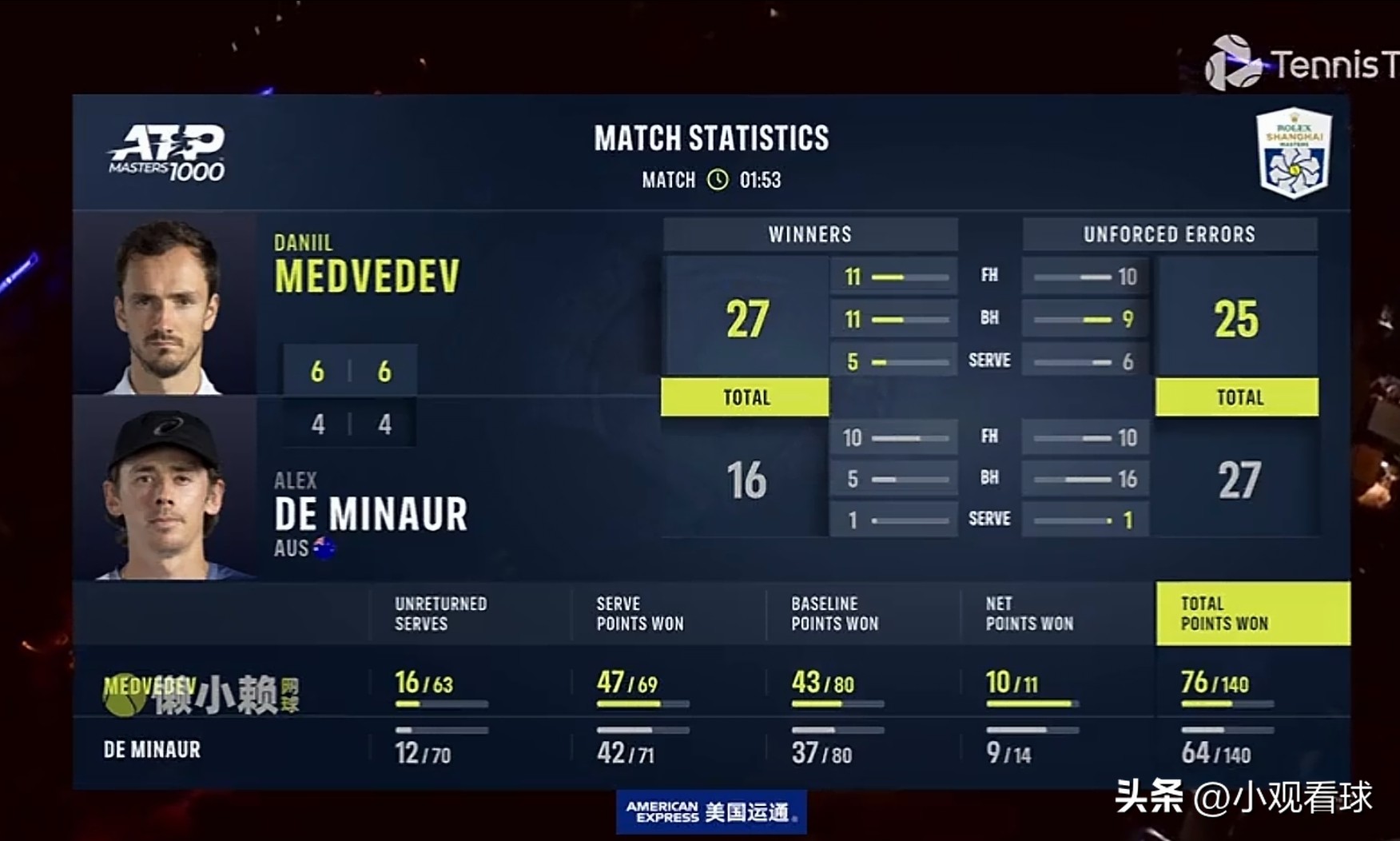 The match against Deminor was fiercely contested, with more than 32 points involving rallies exceeding 9 strokes. Facing a somewhat fluctuating Deminor, Medvedev held the advantage through his play. The 29-year-old hit 11 more winners than the Australian (27-16) and made 2 fewer unforced errors (25-27); in the second set, his first serve win rate was an impressive 15 out of 16, eventually closing the match in 1 hour and 53 minutes.