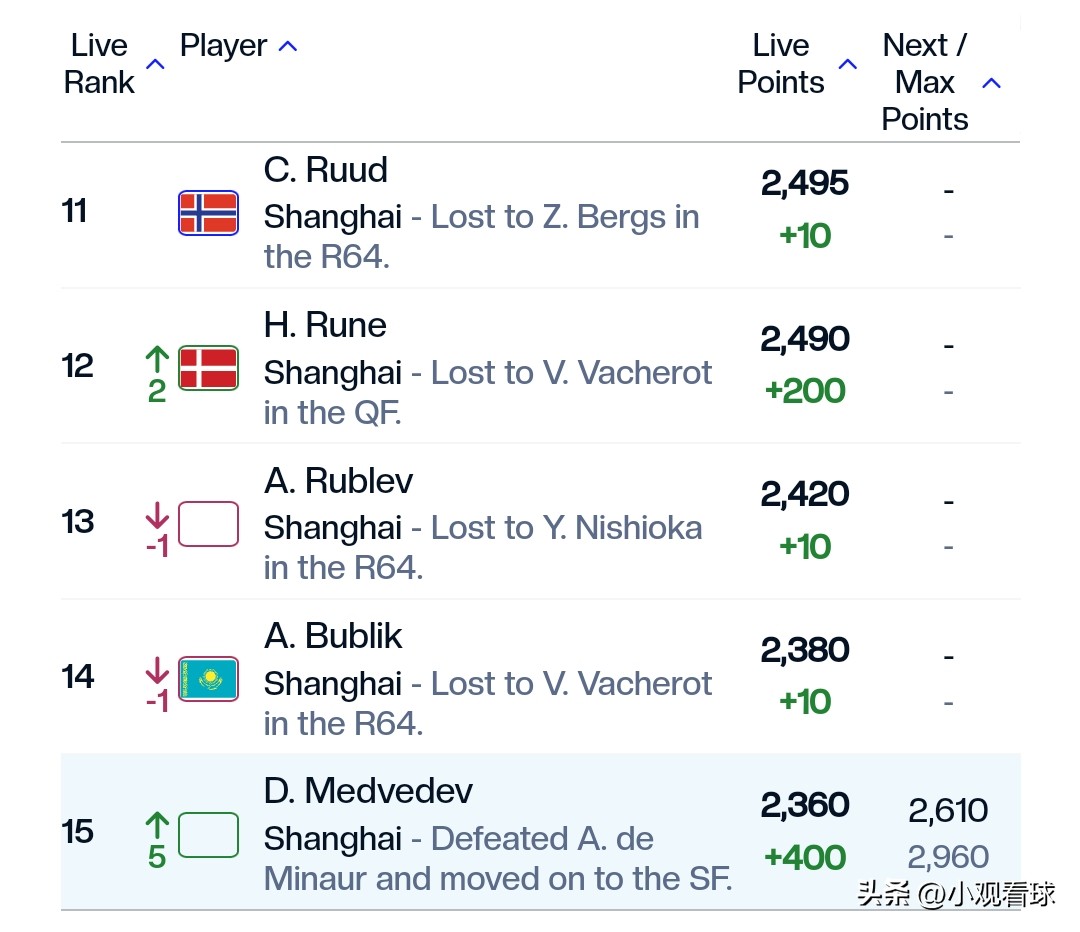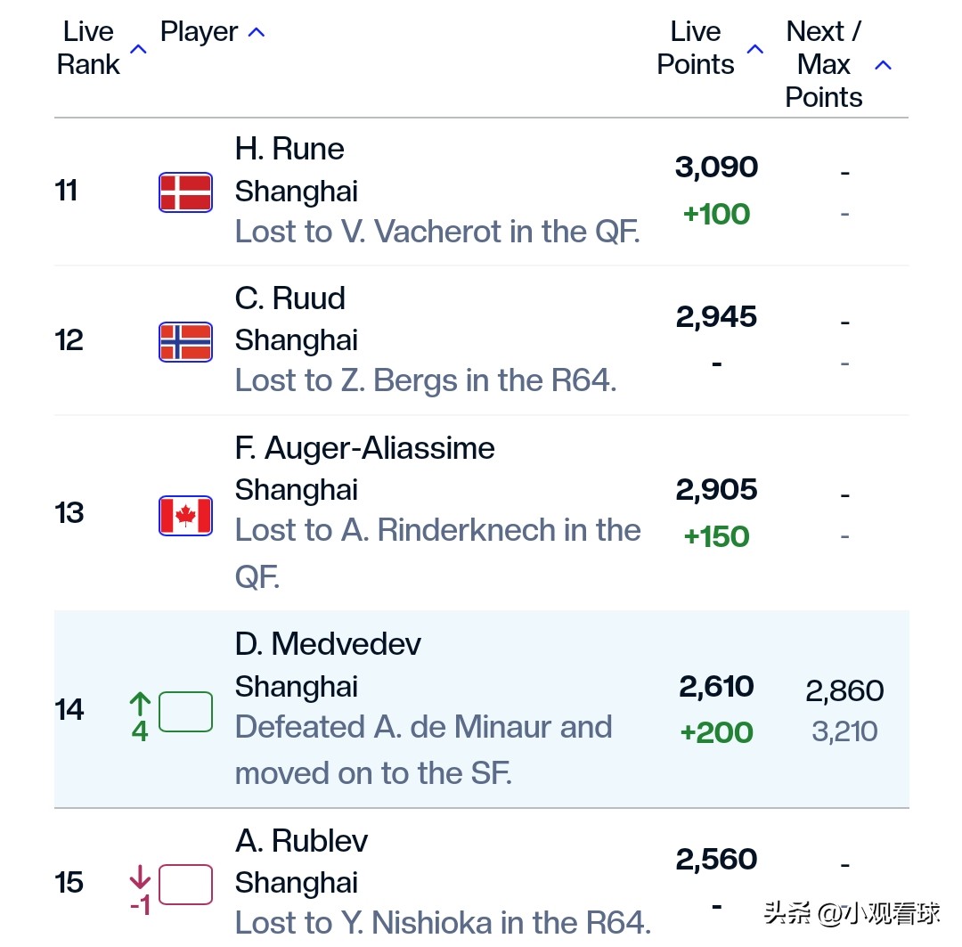 On the direct qualification list for Turin, Medvedev climbed 6 places to 15th. If he ultimately takes the title, he will move up to tenth, just one step away from qualifying for the year-end finals in Turin.