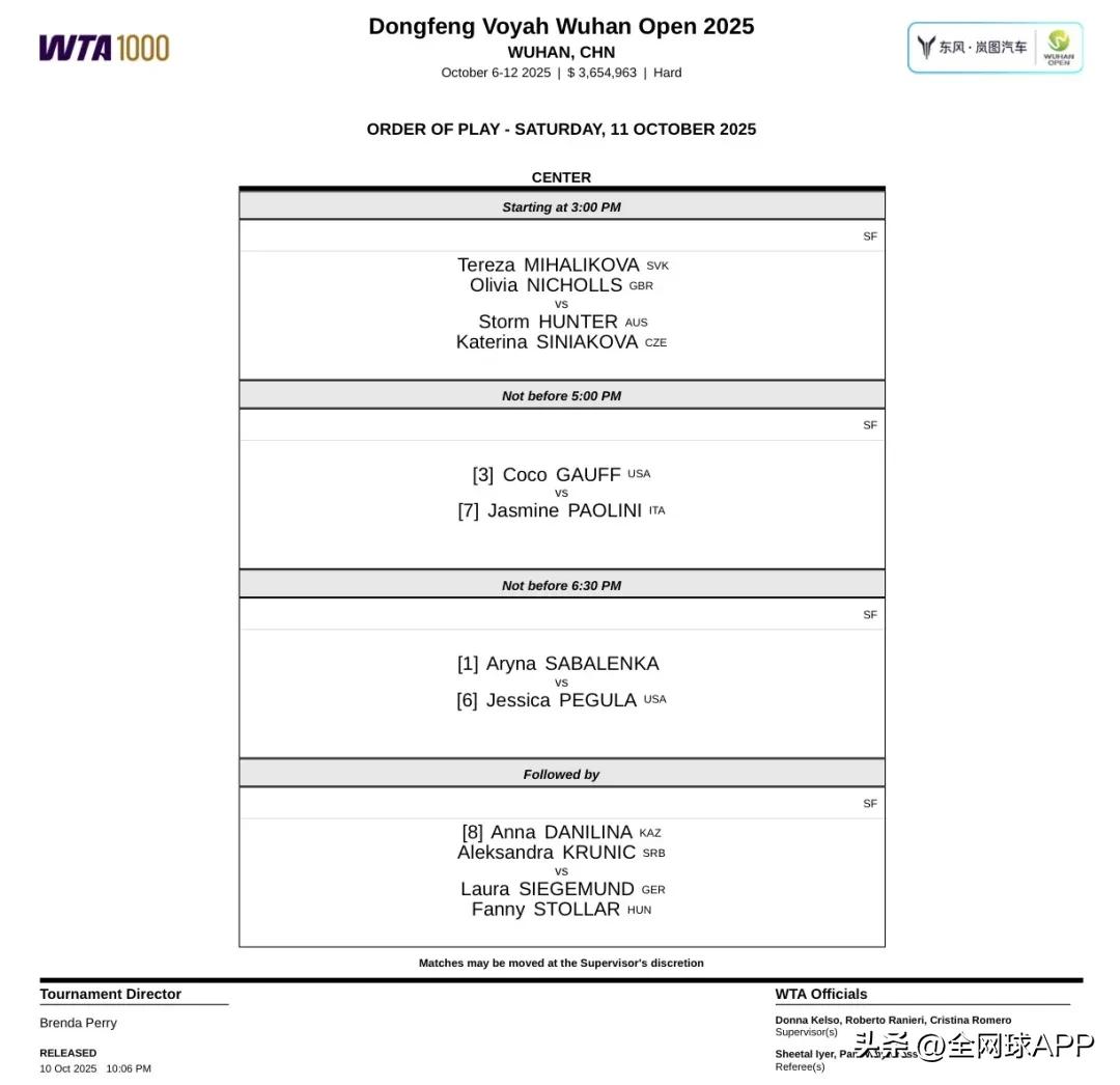 The schedule for October 11th has been released, with the women’s singles and doubles semifinals set to take place sequentially on the center court. At 15:00 Beijing time, Mihalikova and Nichols will face Siniakova and Hunter for the first doubles final berth; the singles semifinal between Gauff and Paolini will start no earlier than 17:00; Sabalenka versus Pegula will begin no earlier than 18:00. The final doubles semifinal, featuring Siegemund and Stollár against Danilina and Krunić, will close the day.