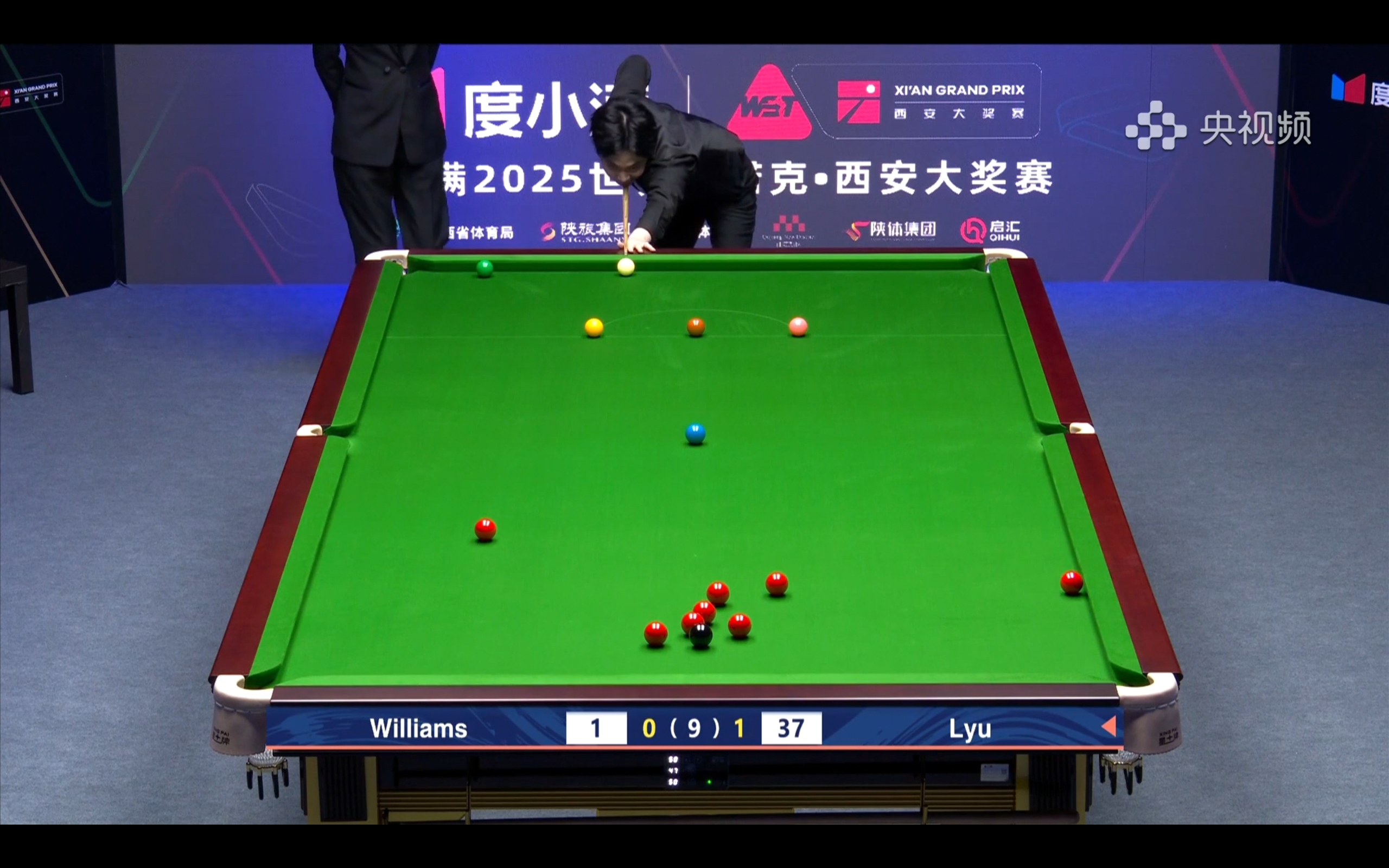 This match uses a best-of-nine frames format; Lu Haotian won the first frame, leading 1-0 in the overall score. In the second frame, Lu Haotian leads Mark Williams 37-1.