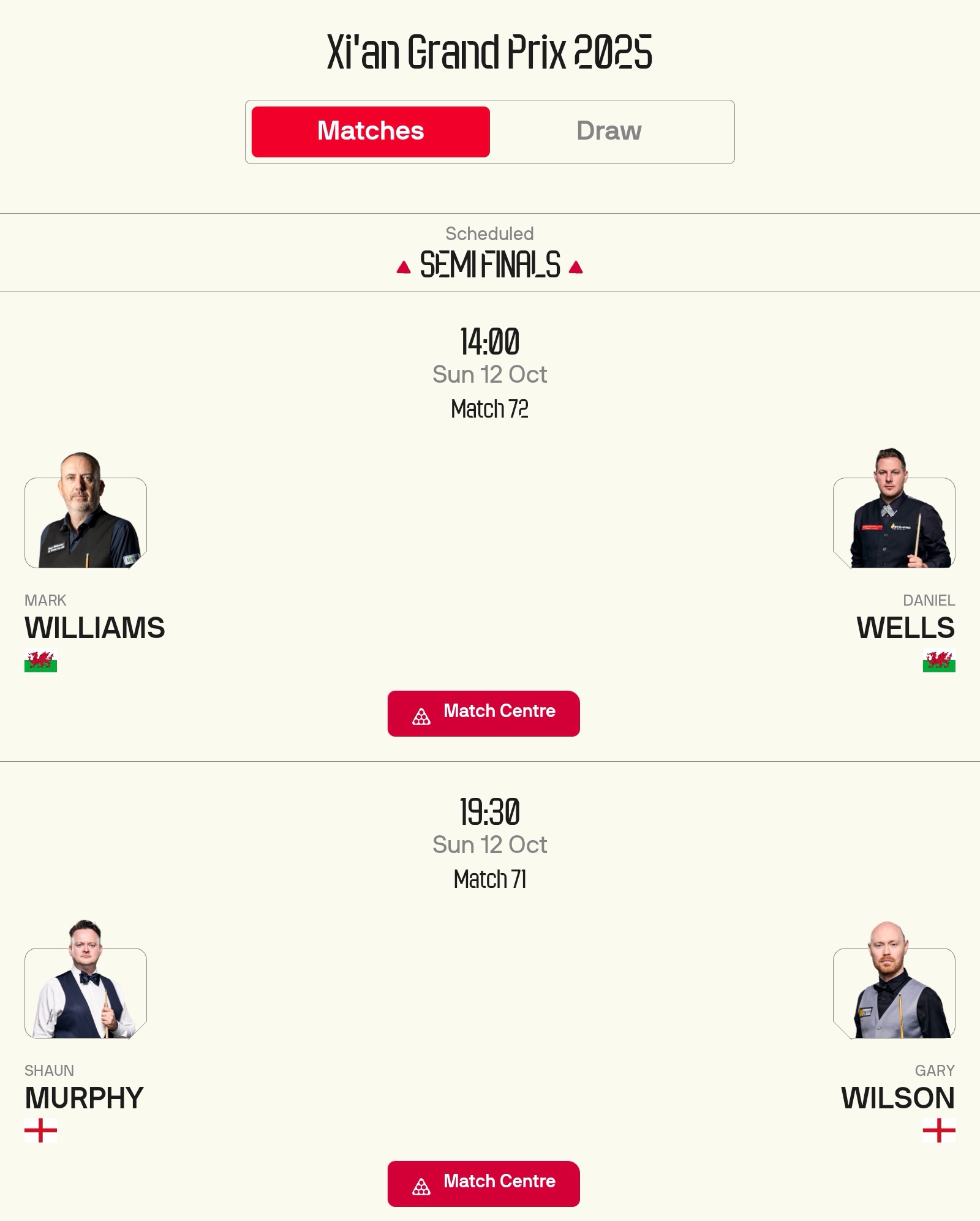 The Snooker Xi'an Masters schedule for tomorrow, October 12, features Murphy, Williams, and Wilson competing, with live coverage on CCTV-5.