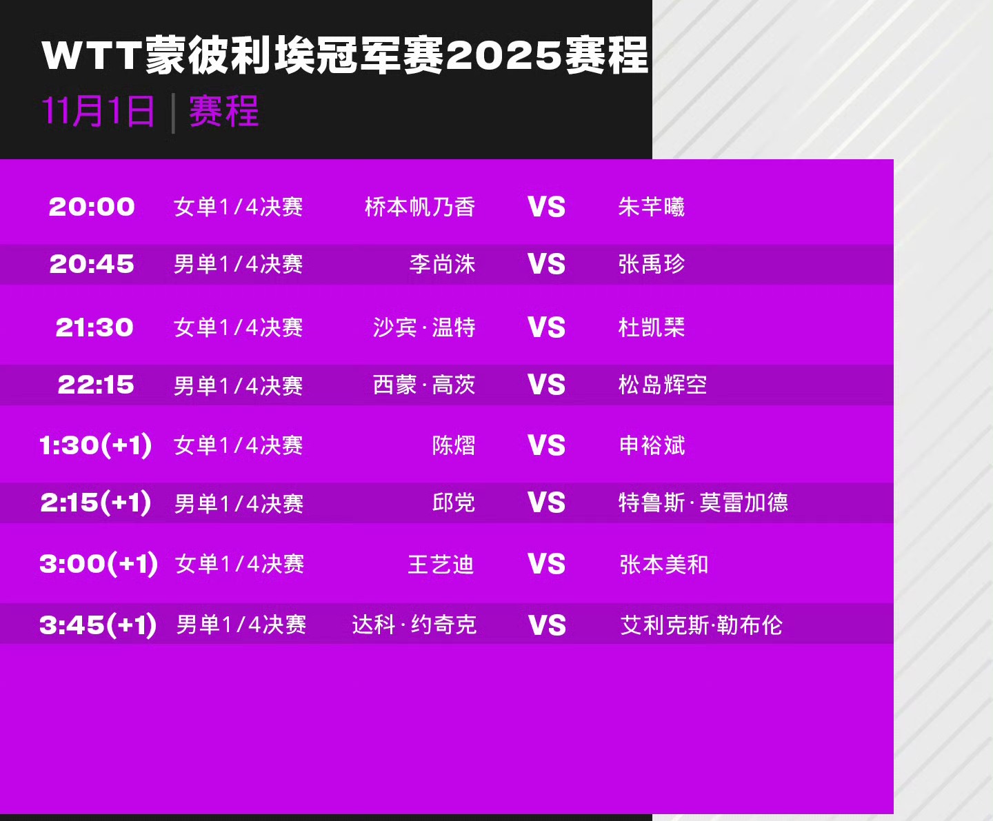 The WTT Champions Montpellier event schedule for today (2025.11.1) has Wang Yidi and Chen Yi competing, with live streaming on Migu Video.