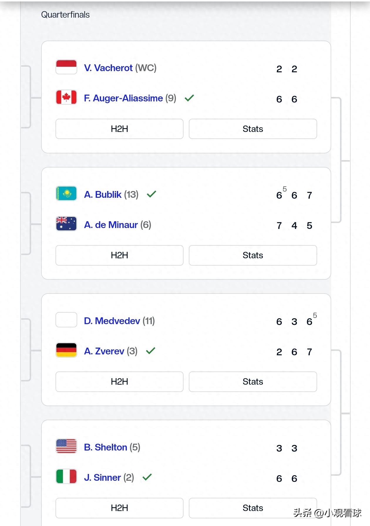 In the third match, Sinner beat Shelton 6-3, 6-3. I didn’t watch the match and have little to comment on. Maybe Shelton was too aggressive? The result is normal, though the scoreline is a bit surprising—Sinner won too easily.