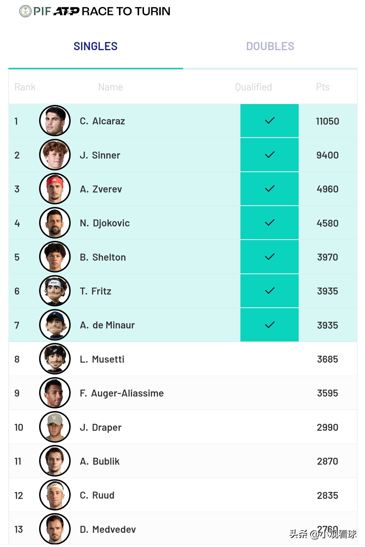 In the second match, Bublik (13) defeated Deminor (6) 6-7(5), 6-4, 7-5. This result aligned with pre-match expectations, not based on skill but on human nature analysis. Deminor recently confirmed his spot at the year-end finals; for him, winning would be a bonus, losing would mean resting early to prepare for the finals. For Bublik, “I’ve come this far, no reason not to fight!” As he said, he still has a chance to qualify for the year-end finals. According to the current Turin rankings, Bublik has surpassed Ruud and Medvedev. This position could at least secure a bench spot.