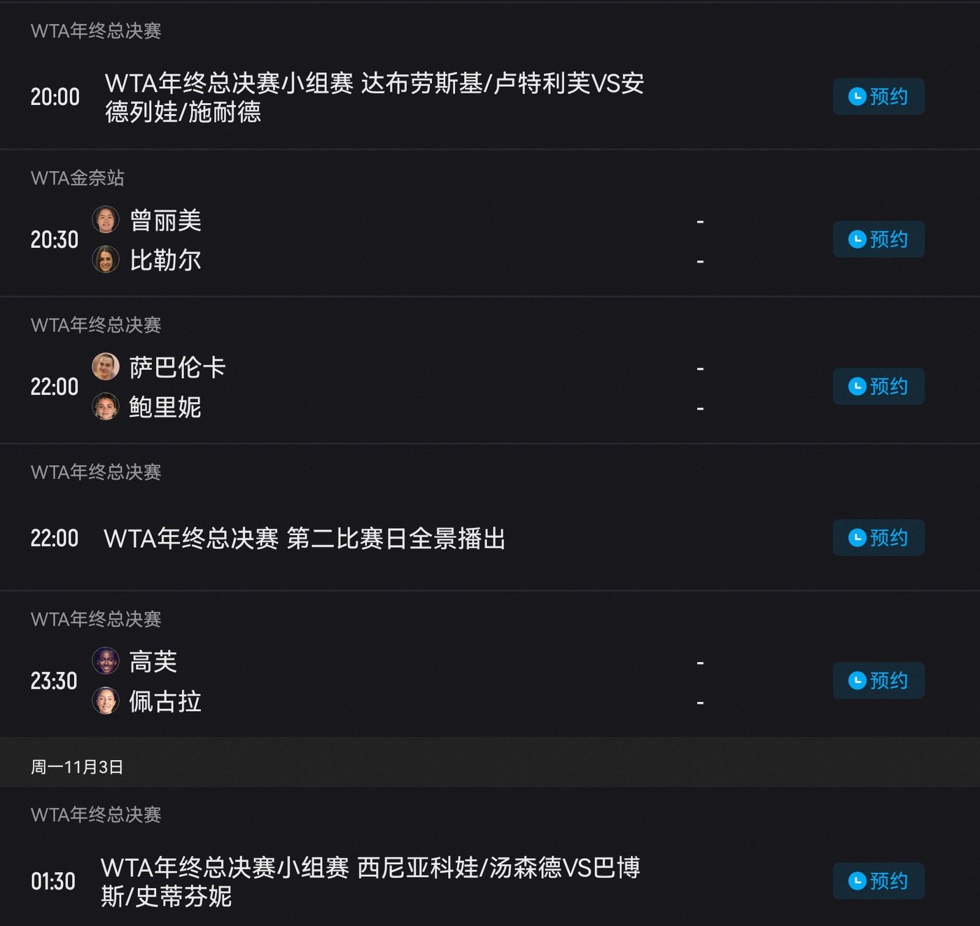 The tennis WTA Year-End Finals schedule for today (2025.11.2) includes Sabalenka, Gauff, Paolini, and Pegula competing, broadcast live on Youku.