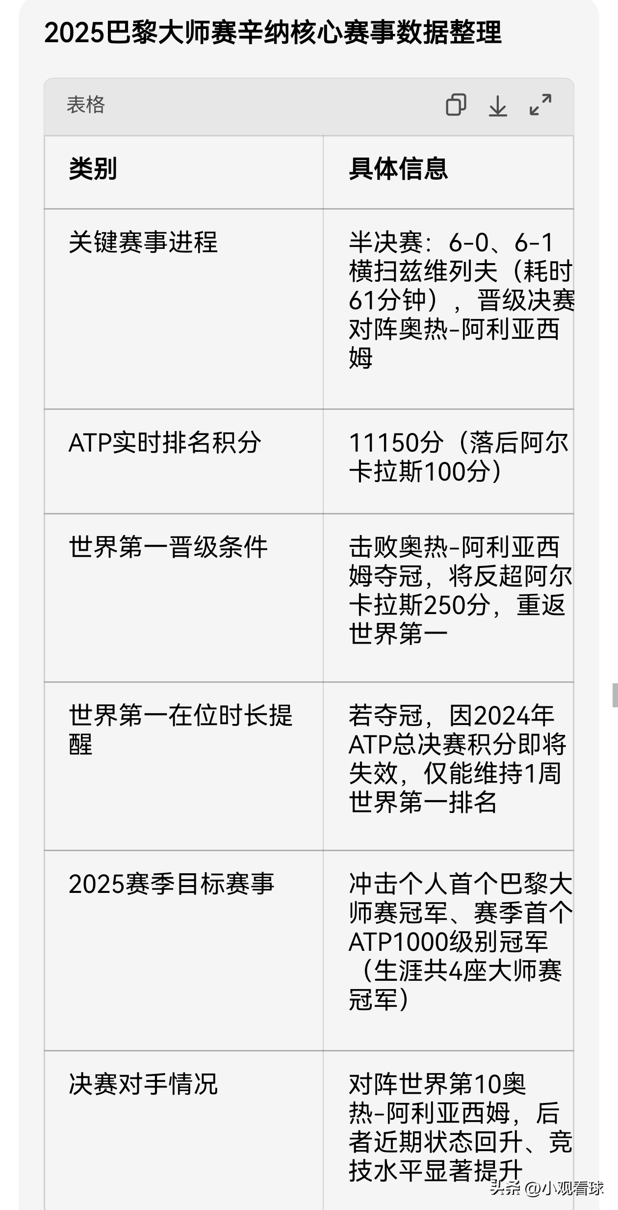 With this semifinal victory, Sinner’s live ATP ranking points rose to 11,150, narrowing the gap to world No.1 Alcaraz to just 100 points. Since Alcaraz was upset in the first round of the Paris Masters by Norrie and has effectively withdrawn from the points race, Sinner only needs to win the final to boost his total to 11,500 points, reclaiming the top ranking by a 250-point margin. Notably, Sinner has recorded ten 6-0 “bagel” sets this season, becoming the first ATP player since Djokovic in 2015 to hit double digits in a single year, highlighting his offensive power.