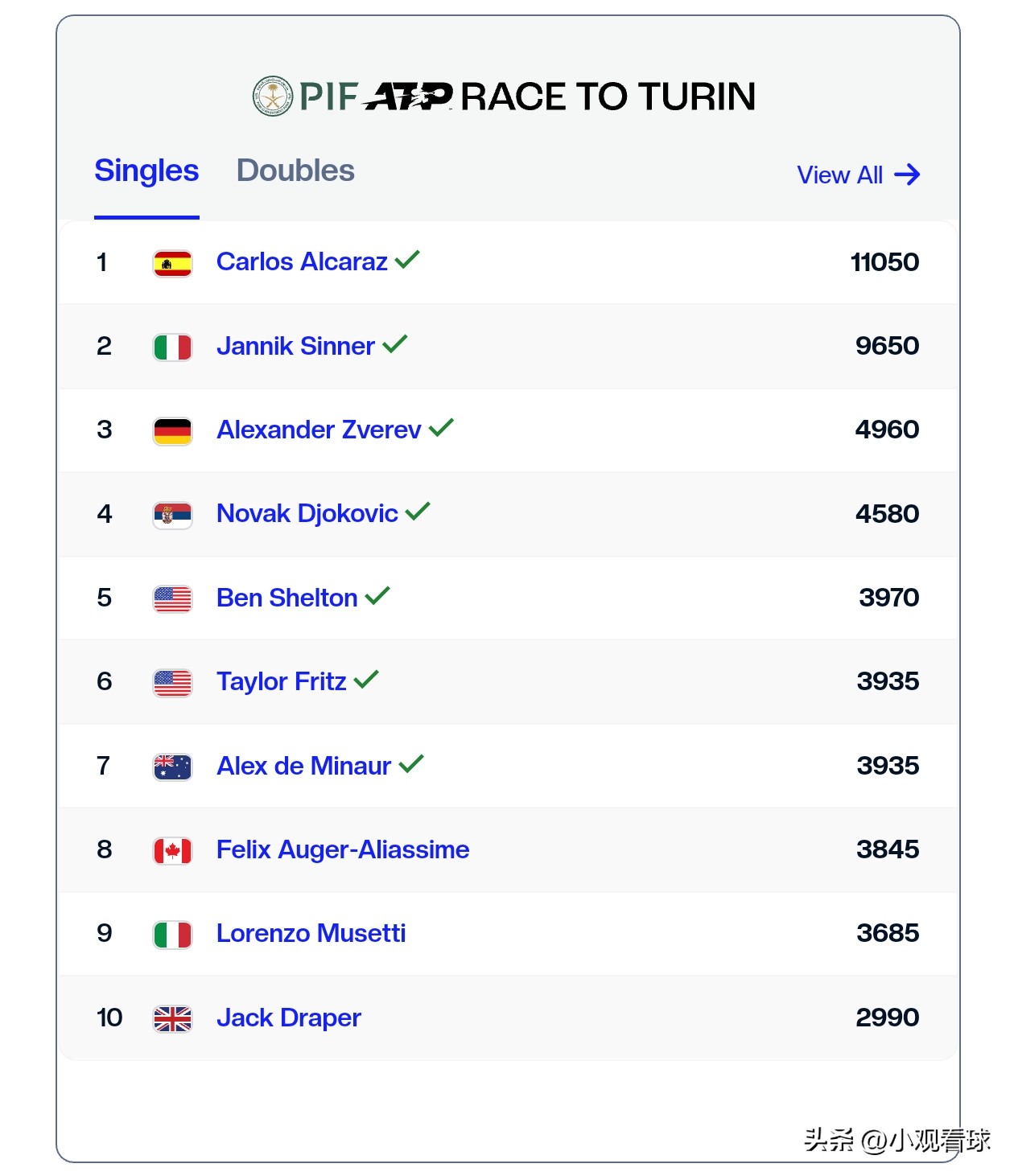 The year-end Finals carry significant ranking points, with an undefeated champion earning 1,500 points—enough to shift the standings dramatically. To solidify his top ranking, Sinner must continue his strong form in Turin after winning in Paris; meanwhile, Alcaraz could overturn the standings by earning over 500 points there. This battle for world No.1, ignited in Paris, may reach its climax in Turin.