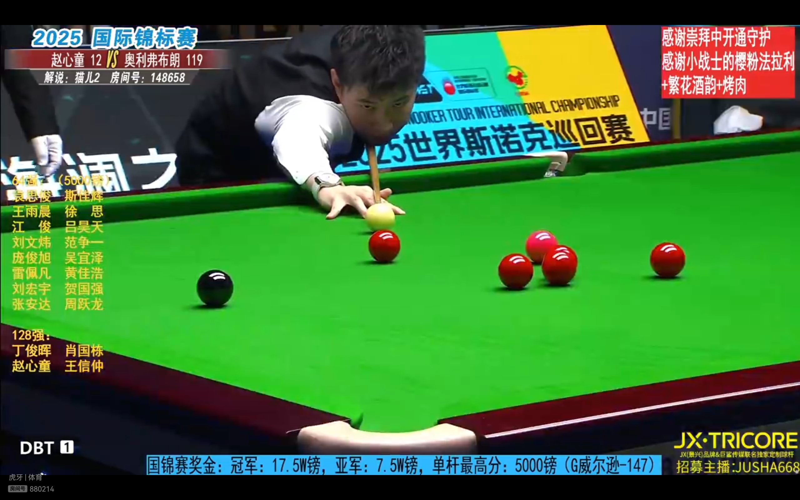 The Snooker National Championship is live on Huya and Migu streaming platforms, featuring players Zhao Xintong, Xiao Guodong, Yuan Sijun, He Guoqiang, Jiang Jun, and Liu Hongyu.