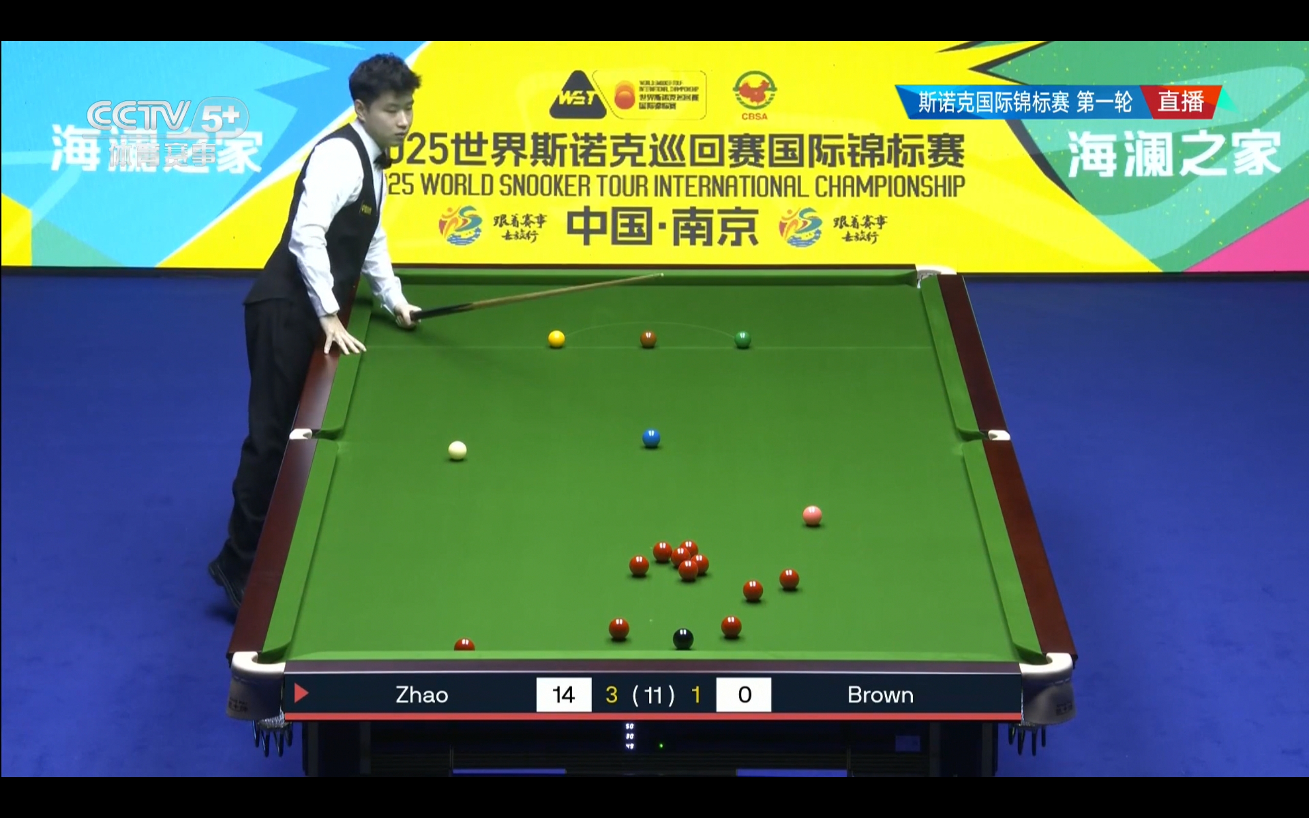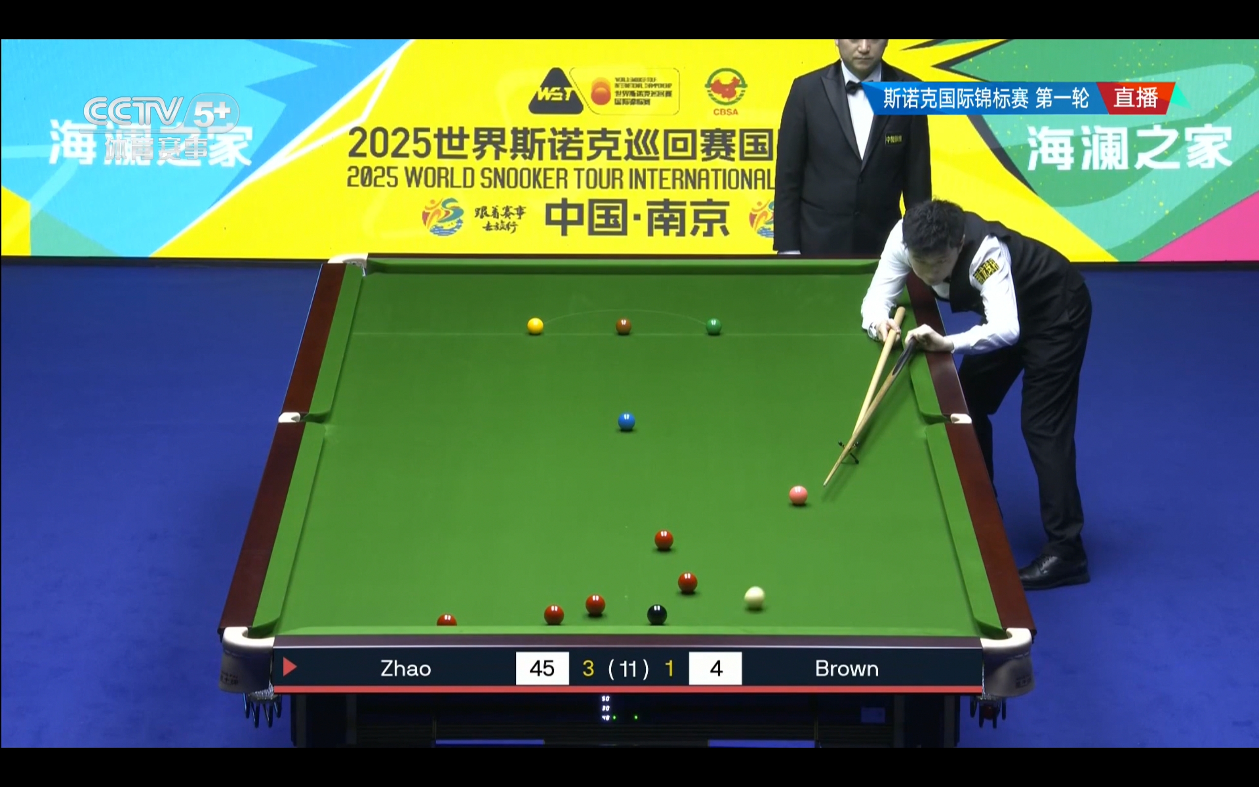 CCTV-5+ is currently airing the live snooker match between Zhao Xintong and Brown at the National Championship.