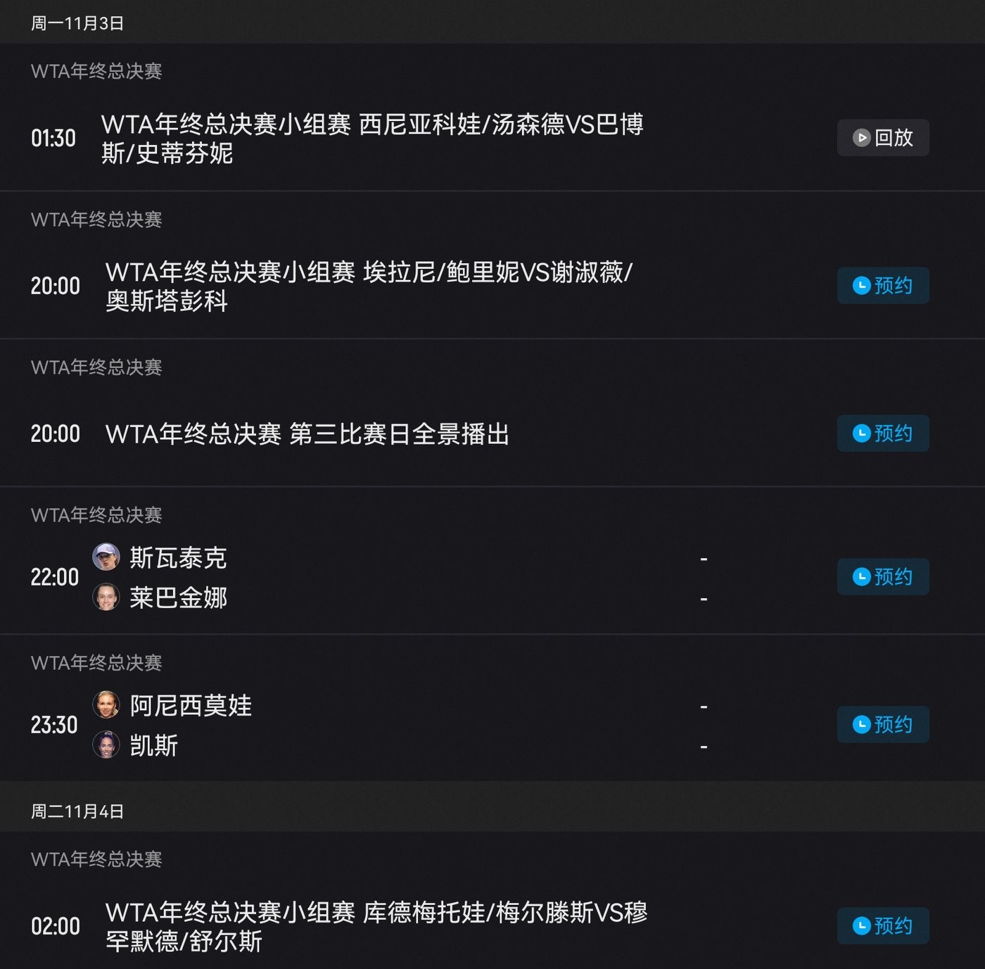 Today's WTA Finals schedule (2025.11.3) includes Swiatek, Rybakina, Anisimova, and Keys competing, with free live streaming on Youku.