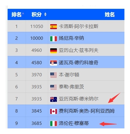 With the Paris Masters concluded, the last major event of the year—the ATP Finals—is about to take place. So far, seven players have secured their spots: Alcaraz, Sinner, Zverev, Djokovic, Fritz, Shelton, and Deminor. The final position is eagerly awaited by fans, and according to the current rankings, it will be contested between Auger-Aliassime and Musetti.